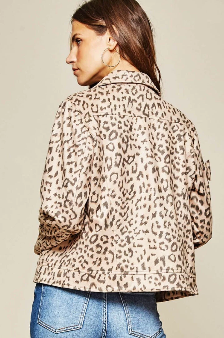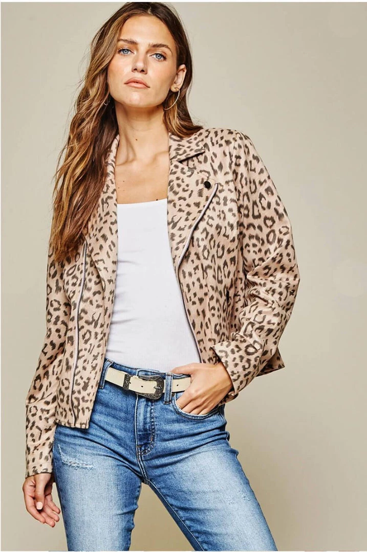 Hello to this new motto jacket of the season! This leopard printed jacket features a zipper on the front, long sleeve, pocket on the front. Super chic, cute, and trendy! Fully lined inside, great quality.