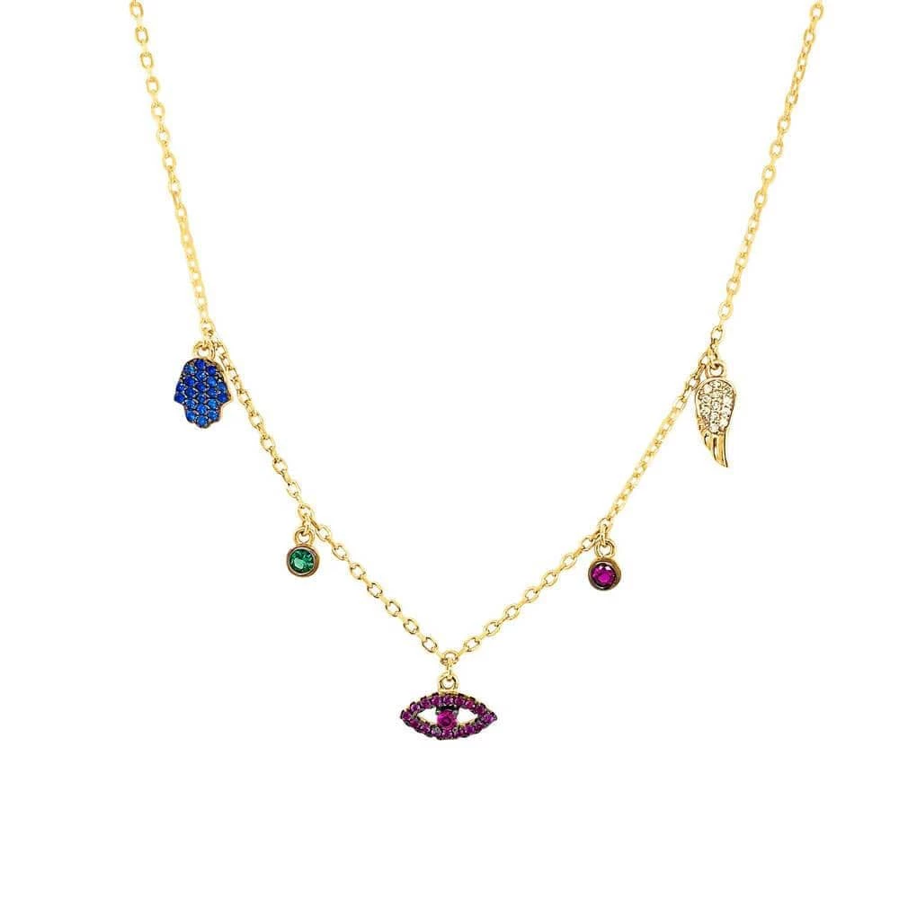 Whether youâre superstitious or not, this Protection Charm Necklace has got your back. Even if youâre not the kind of girl to worry about broken mirrors, black cats or walking under ladders, weâre sure youâve been around long enough to realize that plenty can go wrong in life, and having some backup never hurt. Luckily for you, hereâs a way to do it thatâs also aesthetically on point. This delicate, bohemian necklace will bring a little bit of good luck bling to your jewelry collection, even if youâre not worried about warding off bad luck. It comes with a sixteen inch .925 sterling silver chain coated in high quality gold vermeil, and features five sparkling charms that add a hint of dazzling color to any outfit. The charms come in the form of a Hand of Fatima, a feminine symbol that keeps negative energy any, an Evil Eye charm to keep you safe from misfortune, and an angel wing charm for protection. Two emerald green and ruby red stones hang in between these charms for extra brilliance. And to make things easy, this necklace features a lobster claw closure at the back, so you can put your charms on and take them off whenever you want.