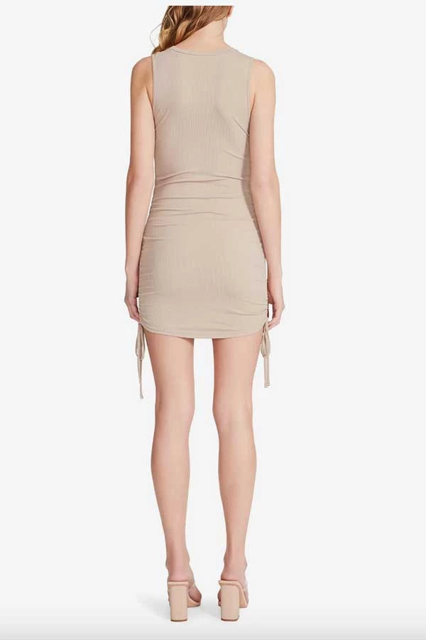 This cute mini bodycon dress from our Smokeshow collection is the perfect choice for a girl’s night out or other special event. The fabric is soft and stretchy, with a ribbed texture throughout. It has an open neckline, short sleeves and ruched sides that tie in the back to add shape and style.