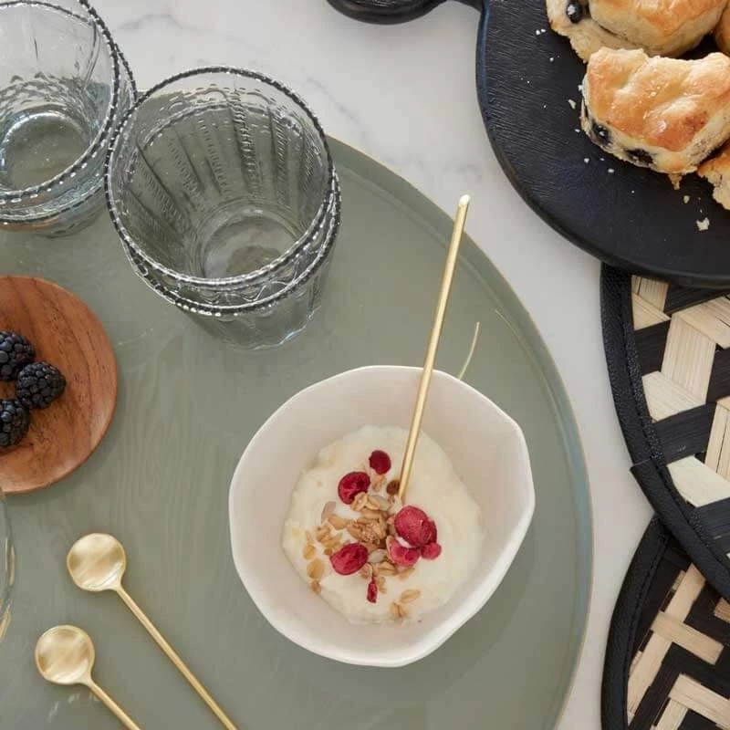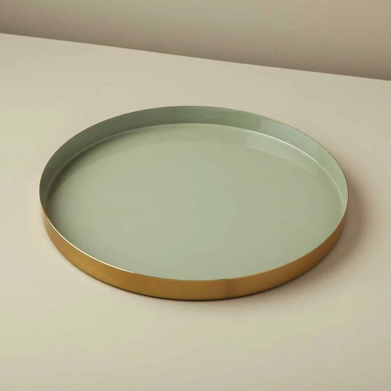 Serene and sophisticated, the Be Home Large Gold & Jade Enamel Round Trays adds a pop of color to any tabletop setting. Whether you’re setting the table or simply seeking an elegant pop of color, this charming tray is sure to please. Featuring gold on one side and jade enamel on the other, it’s a great way to introduce texture and pattern into your home decor or to dress up a cheese plate or holiday appetizers.