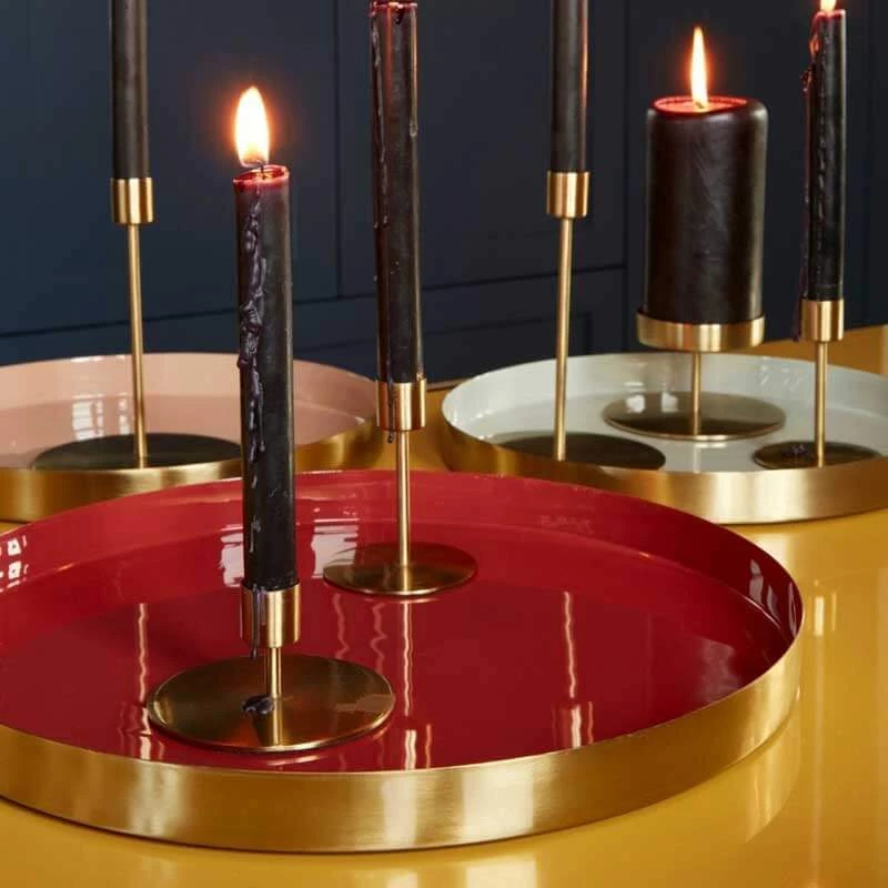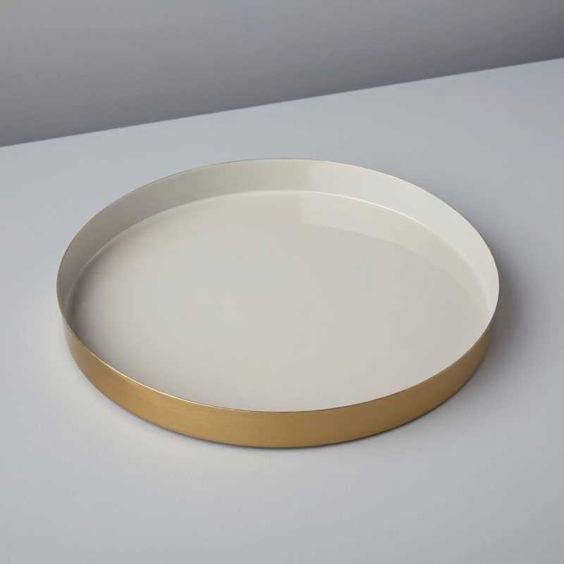 This enameled metal serving tray is perfect for holiday entertaining, or just to add a little color to your life. It’s ideal for serving snacks or desserts from your kitchen counter, or for setting the table with style during parties and other get-togethers. It features a pale grey background with a small gold star design within a circle. It makes a great gift for someone who loves homespun design elements, while being strong enough to stand strong against everyday wear and tear.