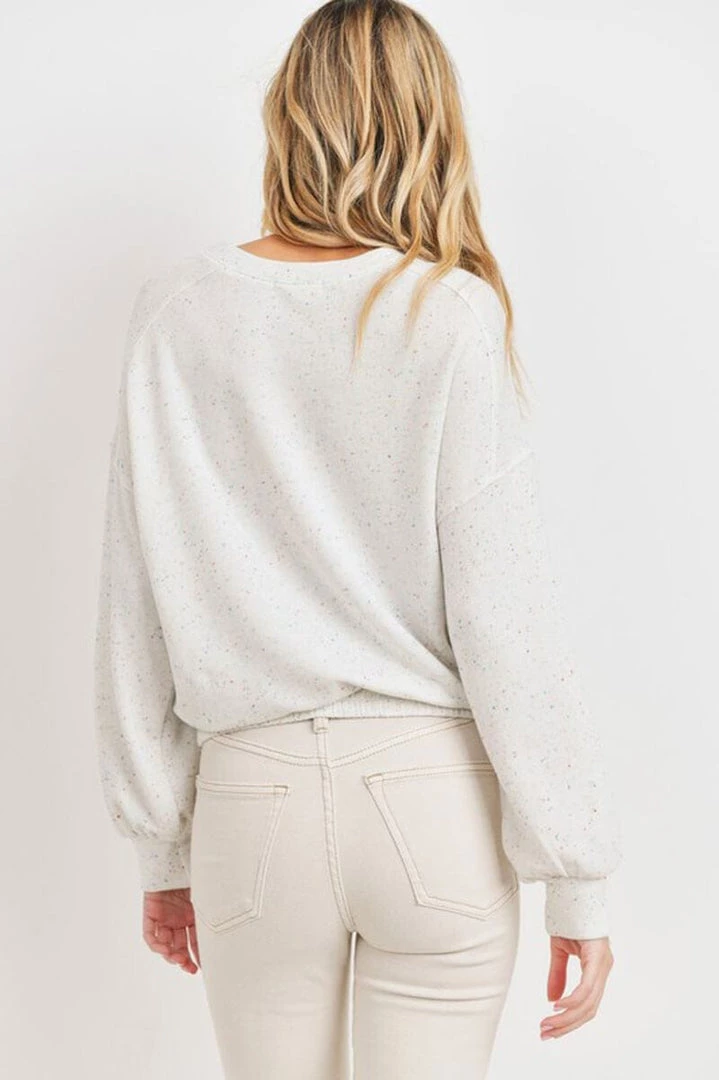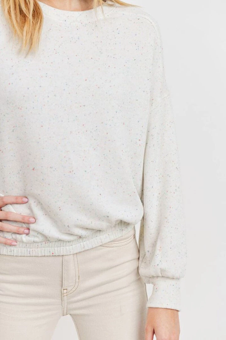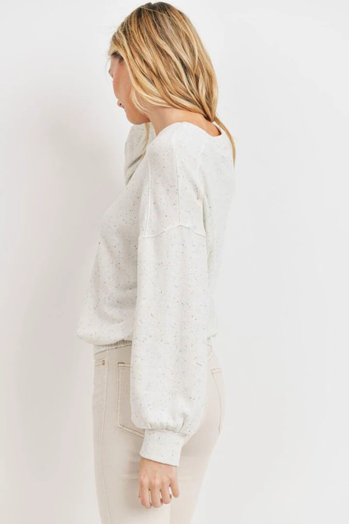 The Confetti Balloon Sleeves Cotton Terry multi-color knit top can transform your look from day to night. It has a drop shoulder seam detail with pin-tucked seams and balloon sleeves with elastic at the waist. This eye-catching semi-sheer piece teams well with high waisted jeans, leggings and skirts.