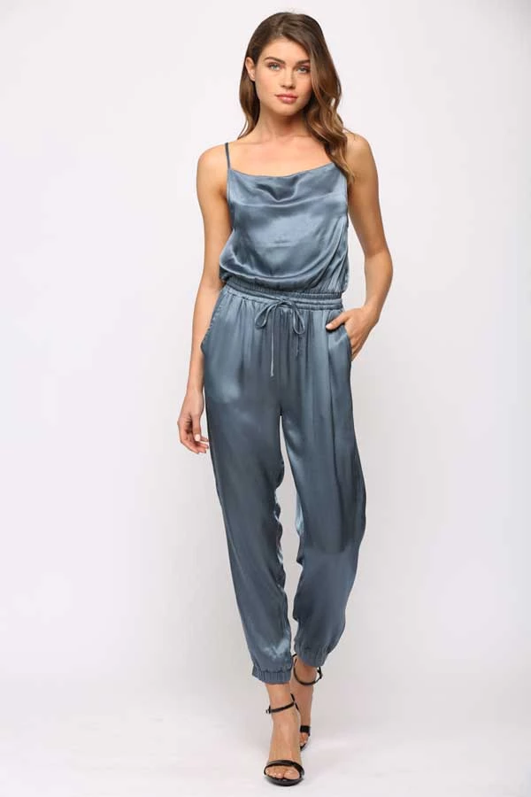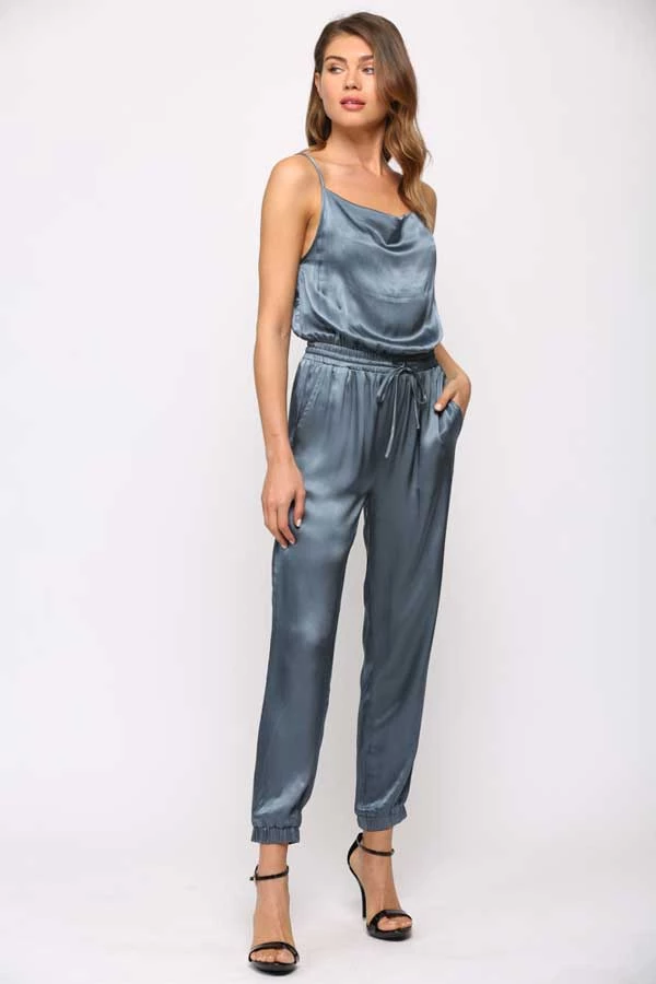 Perfect for the warmer weather and everyday wear, this jumpsuit will become your go-to item for comfort and style. You’ll love the soft fabric, the pockets, and the cute cowl neck camisole top. The length of this jumpsuit hits just above the ankle line.