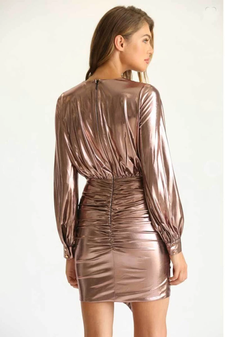 You’ll be one hot mama rocking this Metallic Rose Gold Dress. With its deep plunging V neckline, you can show off your shoulders and chest. The ruched back makes it flattering on every body type. The material is super stretchy so it will hug your curves. Dress it up with stilettos or casual with flats, you’re sure to turn heads with this beauty!