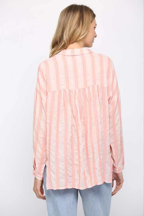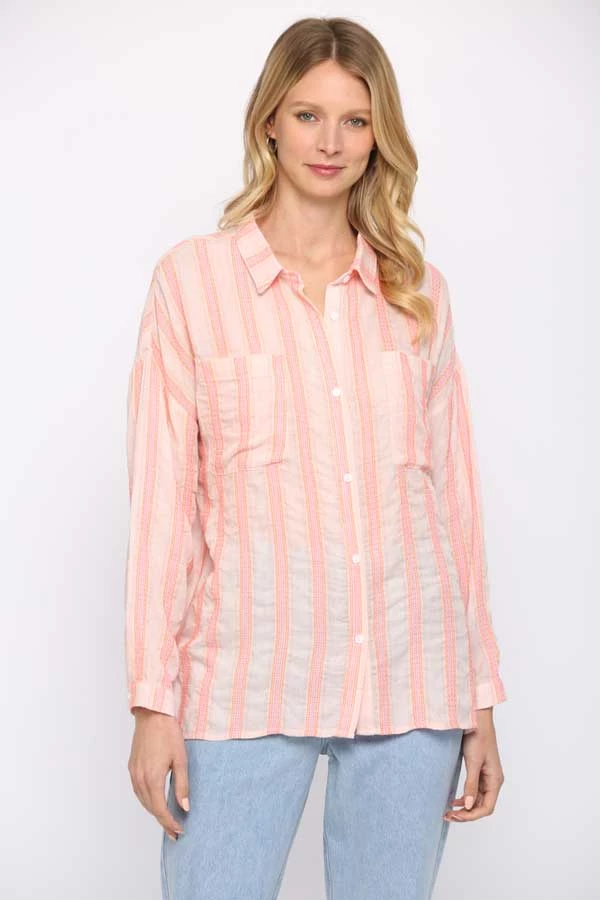 Our Striped Button Down Tunic is the cutest top for cool summer days. Lightweight fabric in pale orange with pink stripes, this top is both fun and flowy. This casual button down tunic can be worn with jeans or to a summer barbecue. Long sleeve with two front pockets for added style.