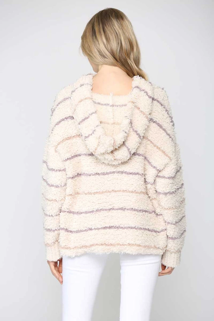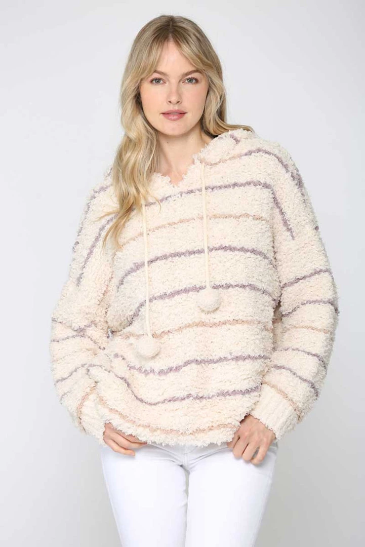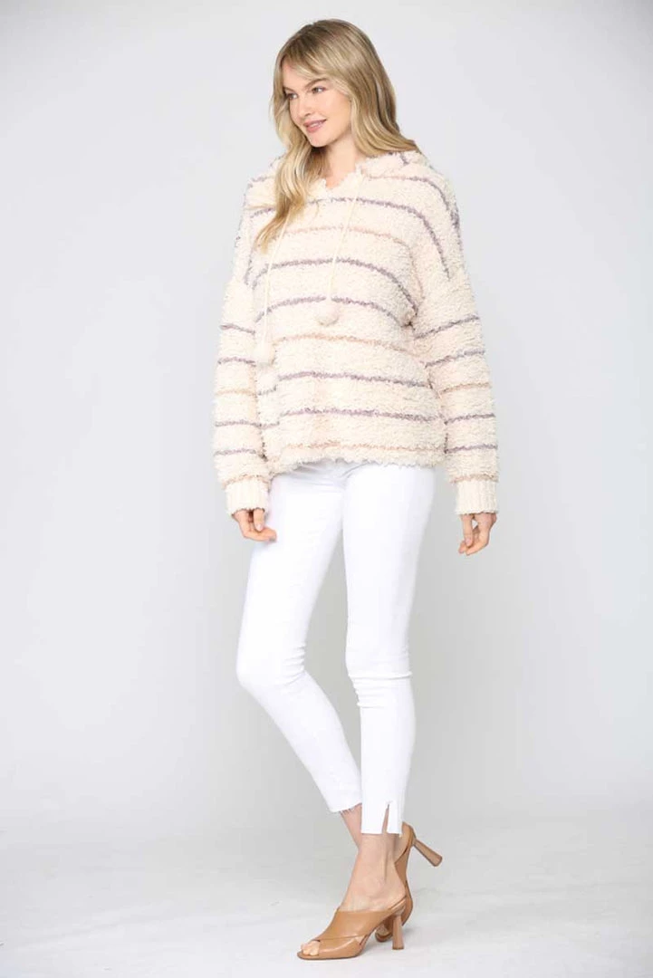 Whether you’re running errands on a cool fall afternoon or spending the day shopping, this Striped Fuzzy Knit Hoodie Sweater will soon become your new favorite. It features contrasting cream and black stripes with pom pom pull ties. Made of soft cozy cotton, it’s oversized for warm days, but can also be worn folded over for colder evenings.