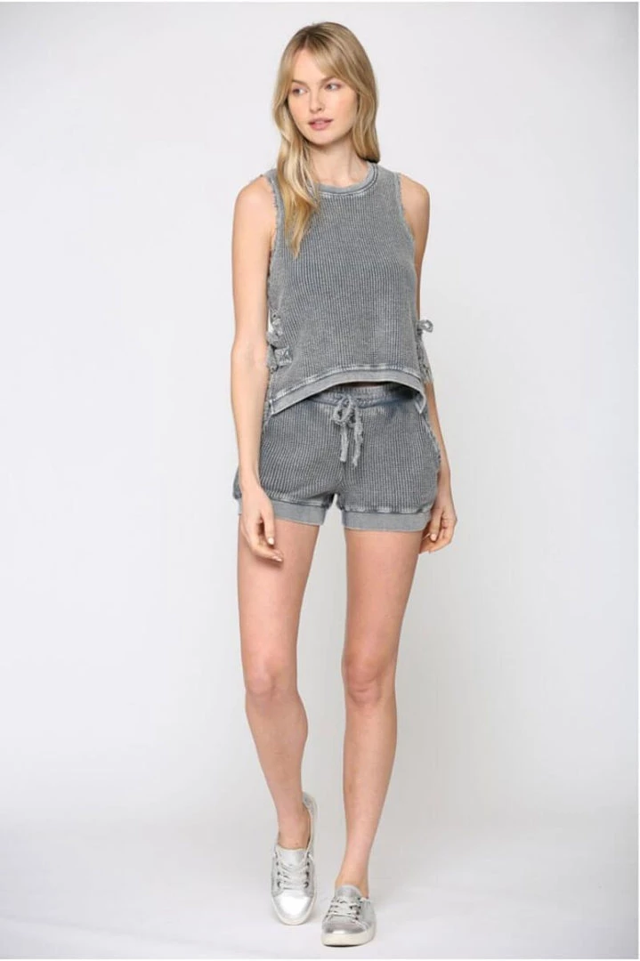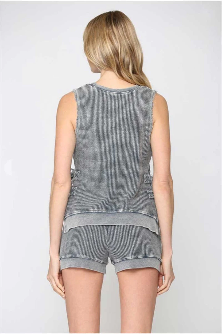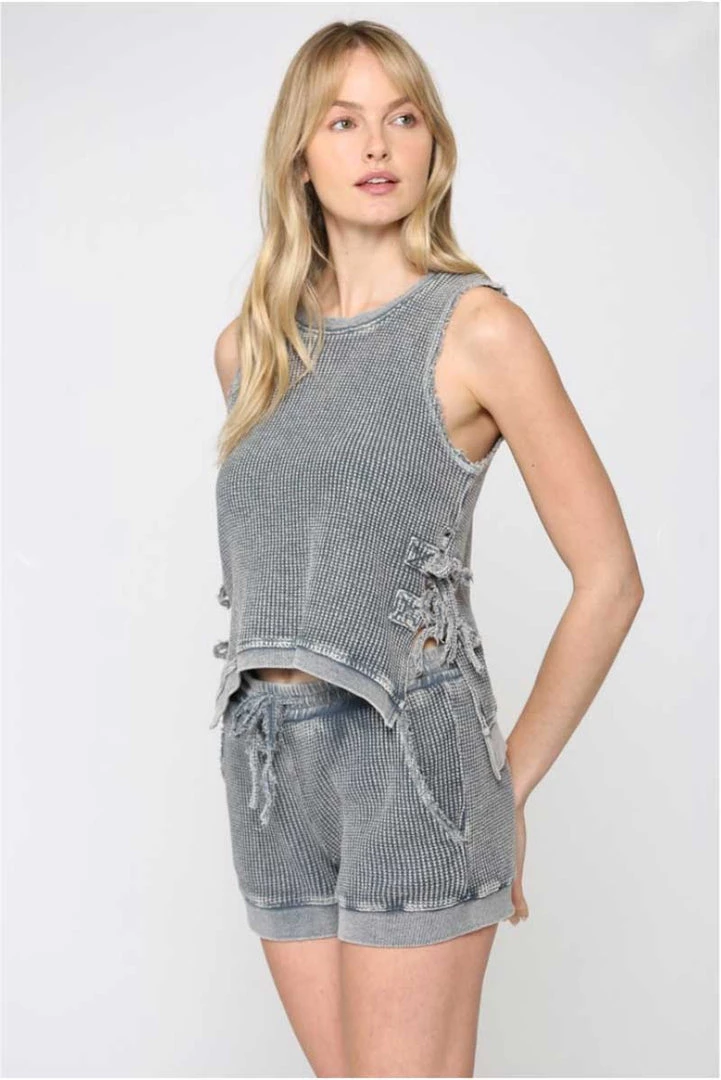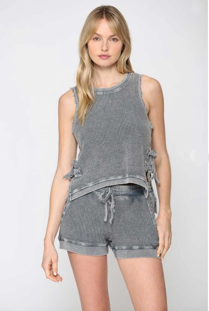 The Washed Waffle Knit Top is the necklace of tops! This single layer tank top is complimented by a side tie detail making it the perfect top to wear out on the town or out to brunch. Pair with distressed denim shorts and clogs for a casual, bohemian vibe or with leather leggings and suede wedges for an alternative-chic look.
