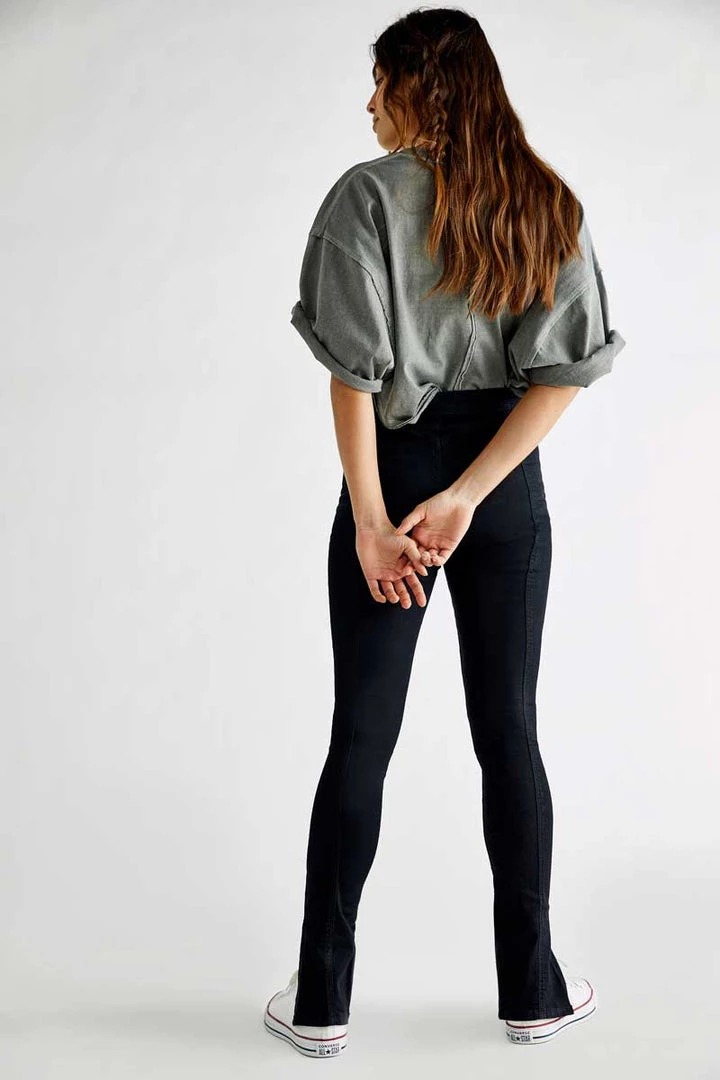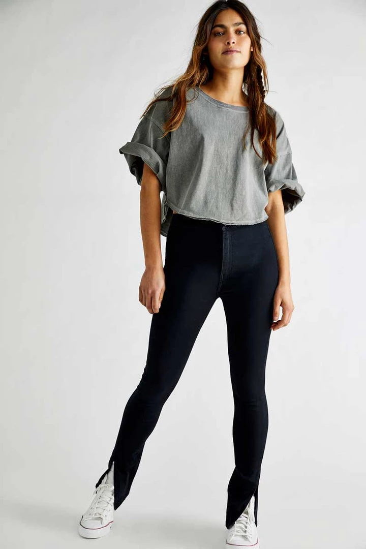 Riley Slit Skinny Jeans from Free People are a modern skinny style with a high-waist and flared silhouette. A button-front closure and frayed hem create a worn-in look, while a raw hem lends a looser fit. Perfect for creating stylish outfits at the cottage or on vacation, these lightweight stretch jeans are sure to become your go-to summer pair.