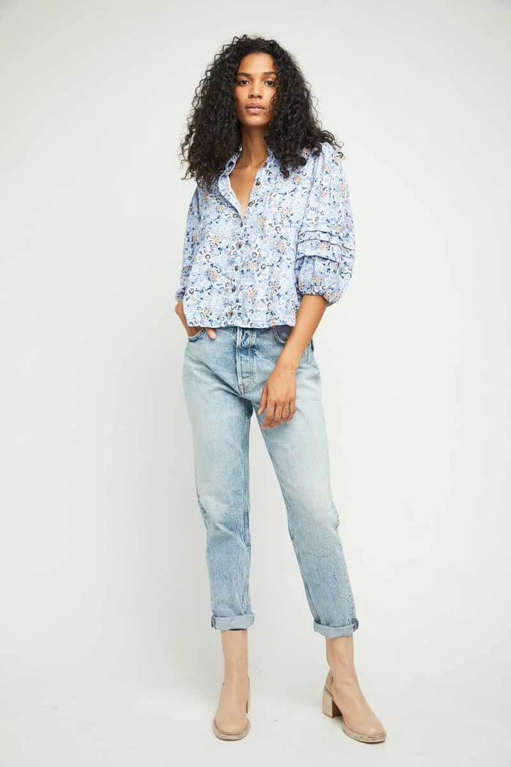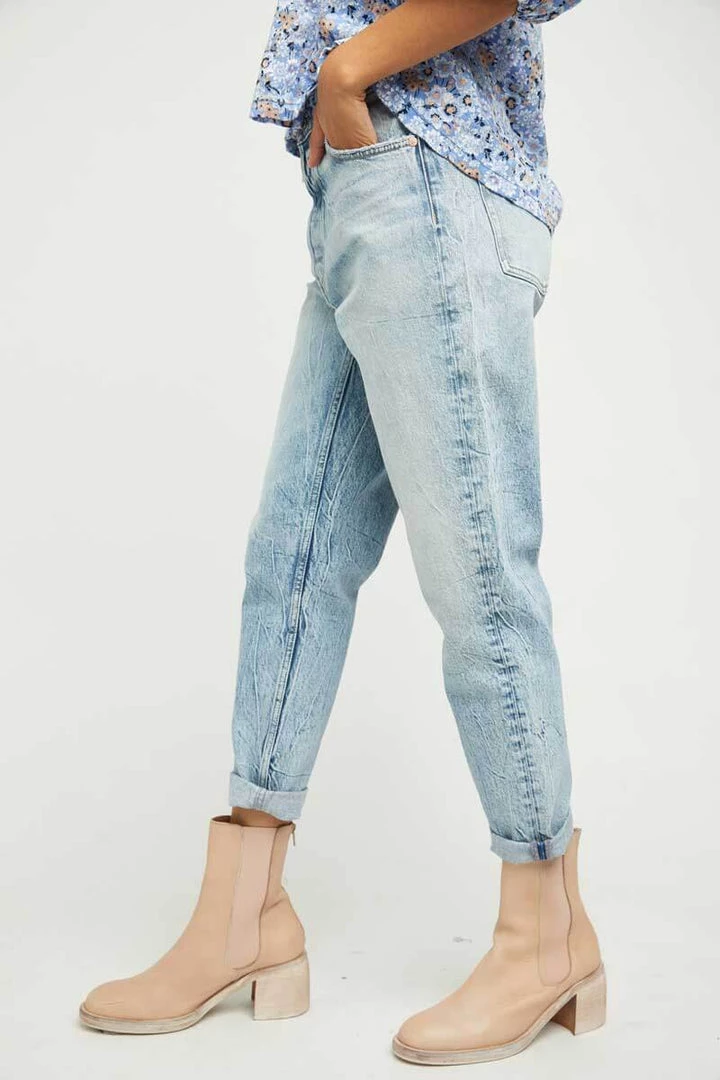 These high-rise denim jeans by Free People are a wardrobe staple for the casual woman. The relaxed fit gives them a true lived-in look, and the semi-fitted waist sits perfectly on your hips. Featured with a five pocket design and button front closure, these jeans are perfect for pairing with flats or boots and transitional layering pieces.