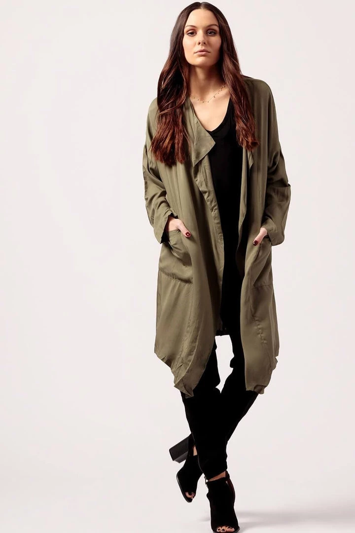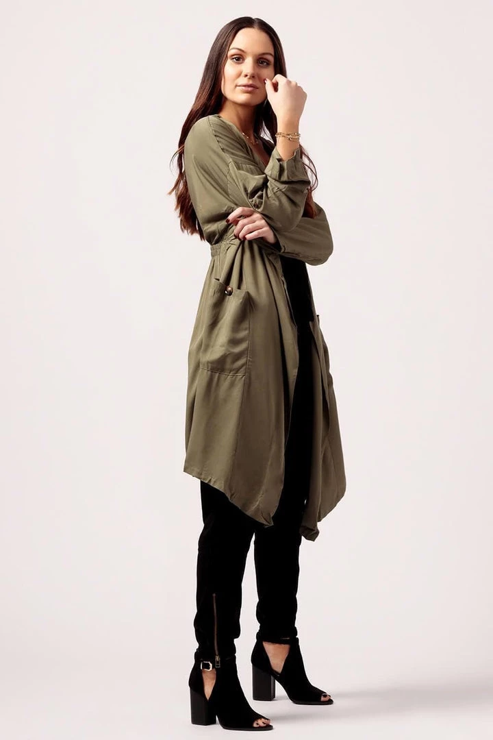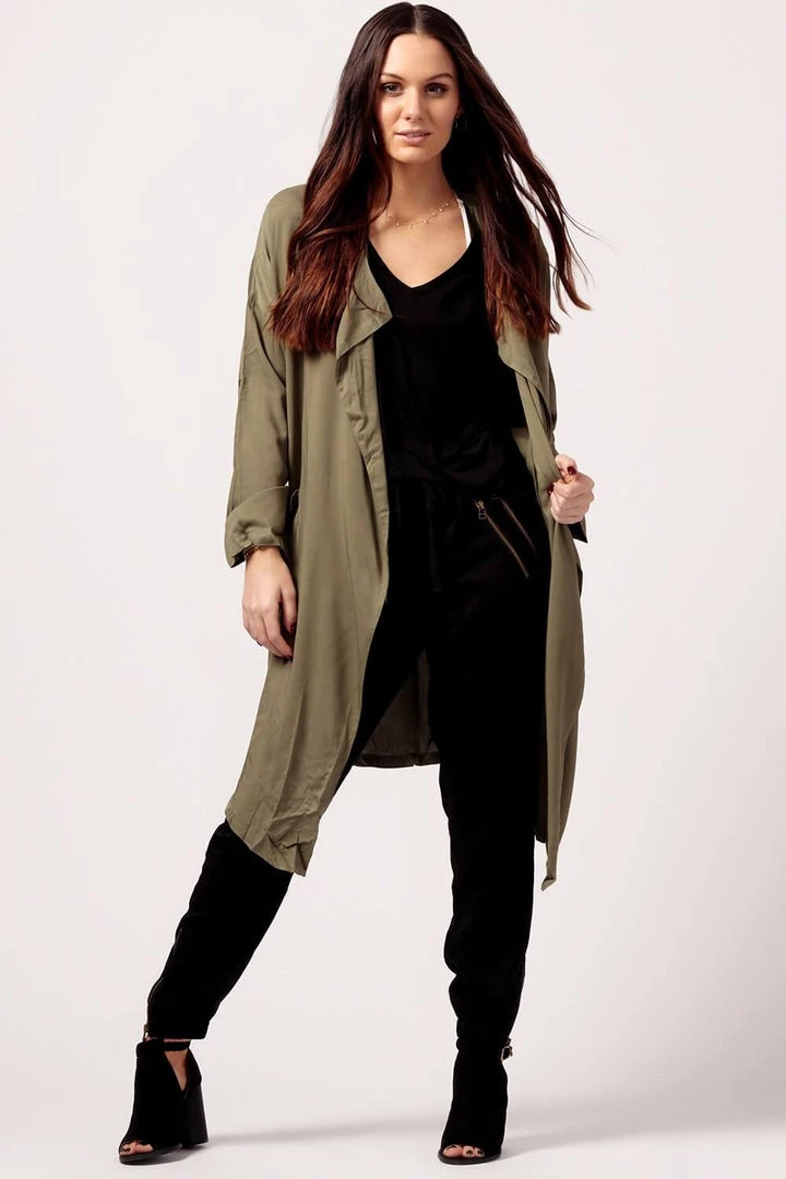 This Army Green Duster Jacket can be worn for many seasons. It has such a casual soft feel that you will want it in every color. The sleeves are cute with the touch of a ribbon. You will feel sophisticated and comfortable wearing this long lightweight duster jacket.