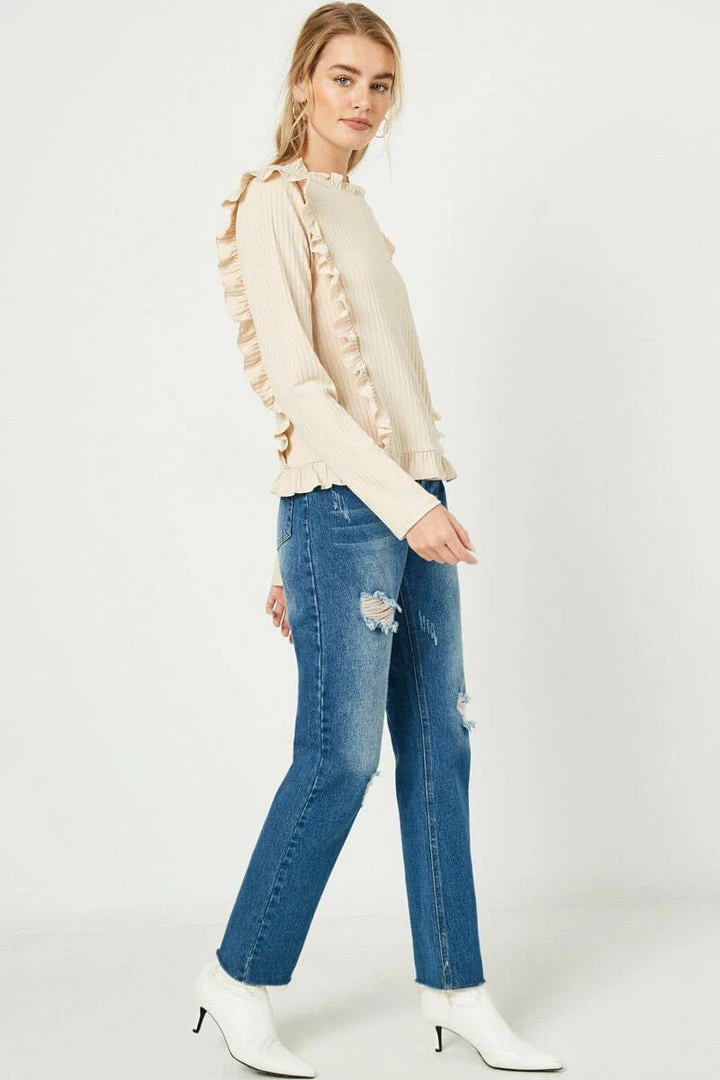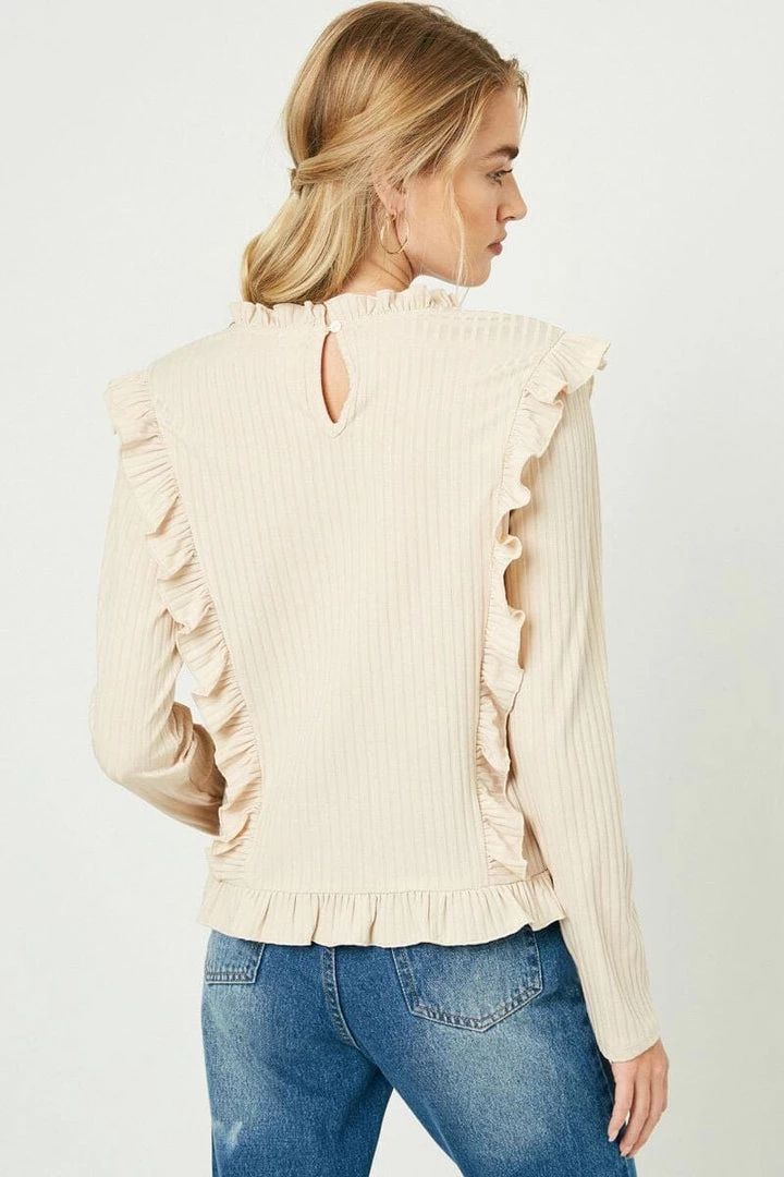 Our long sleeve shirt is a versatile wardrobe staple that you will turn to again and again. Casual yet stylish, it makes a great addition to your everyday collection. The ribbed mock neckline and ruffle detail add an element of style while the mock sleeves add an element of comfort so you can wear this top for everyday use.