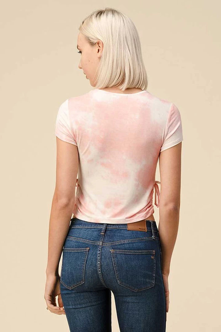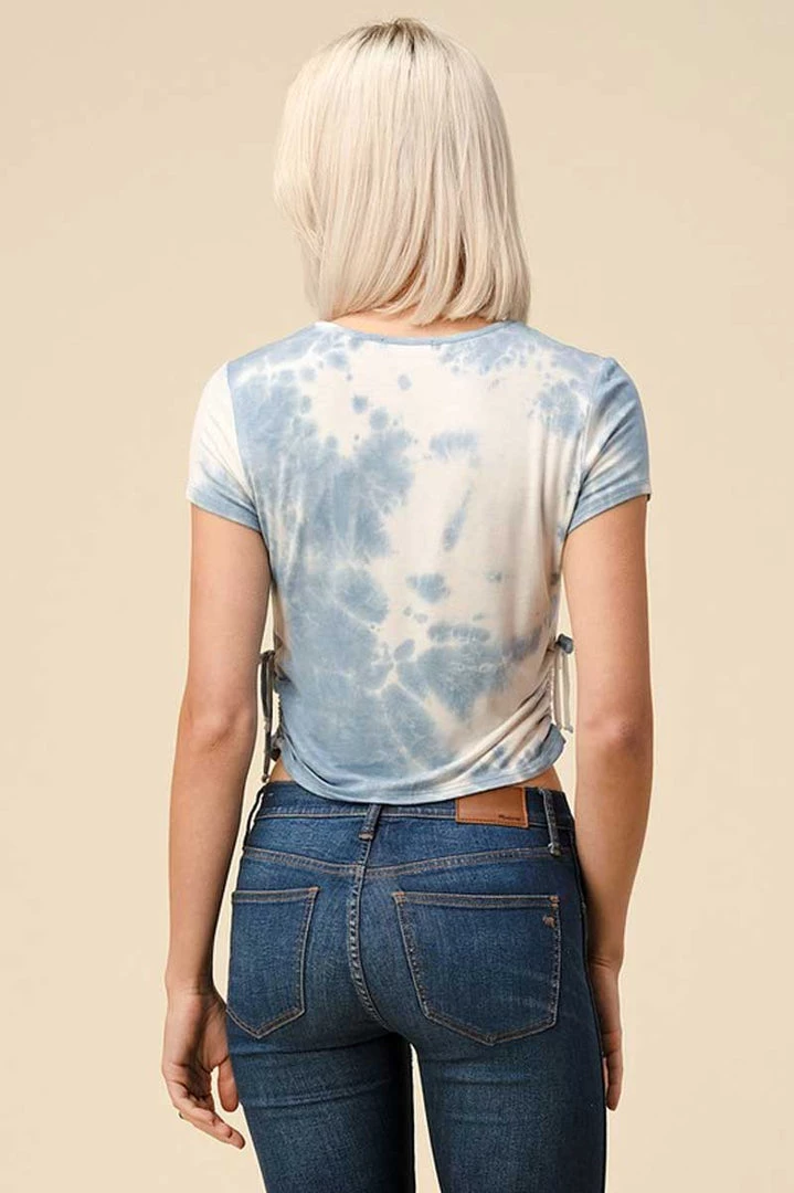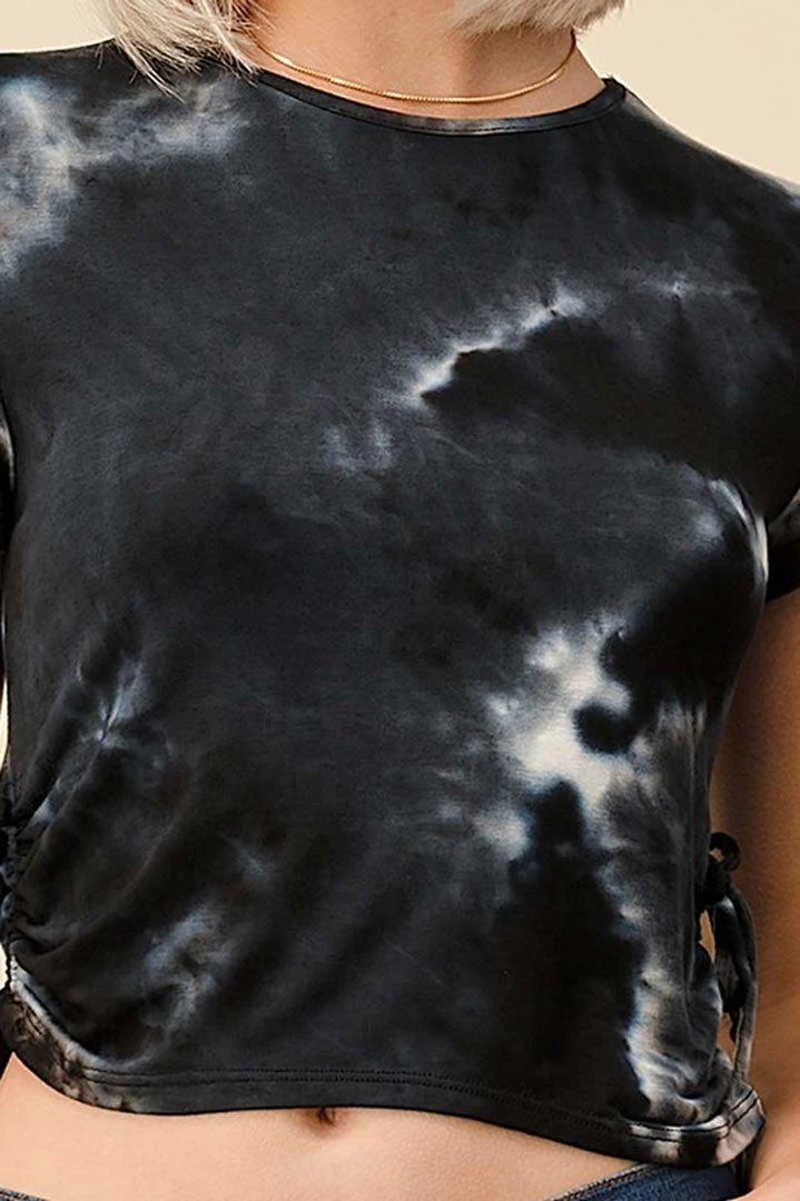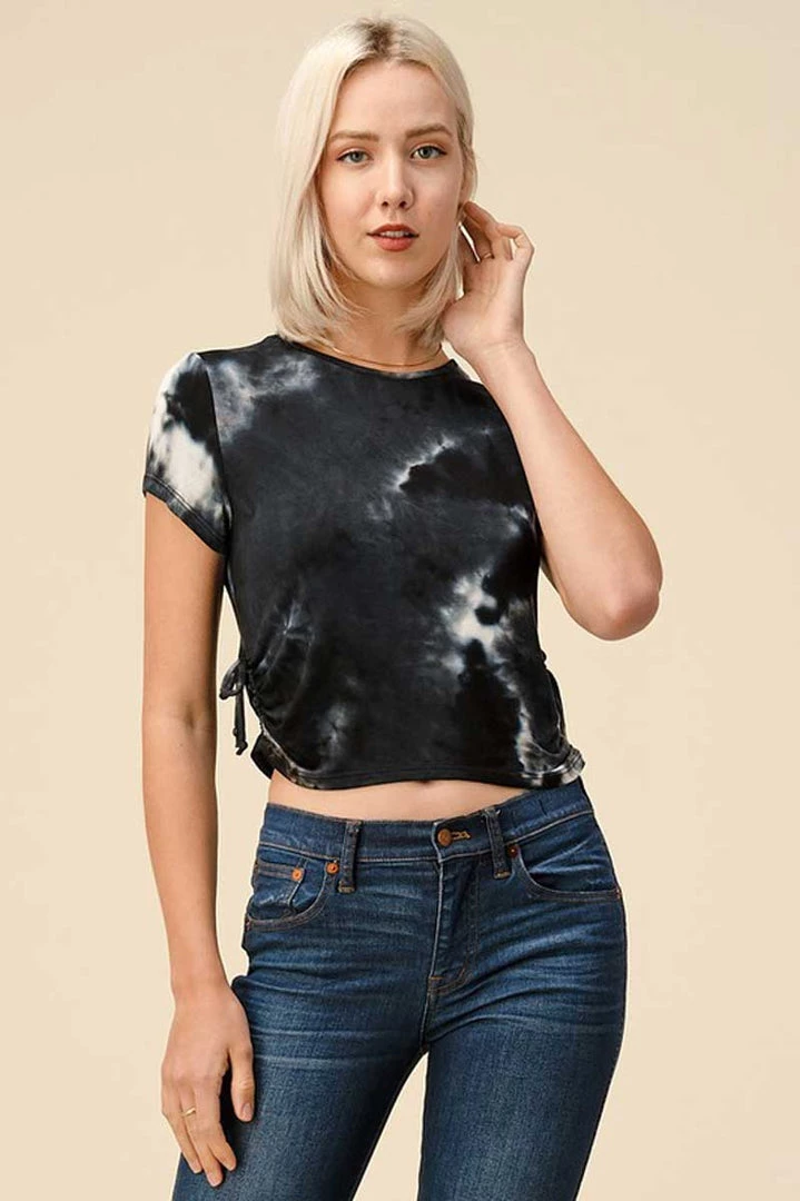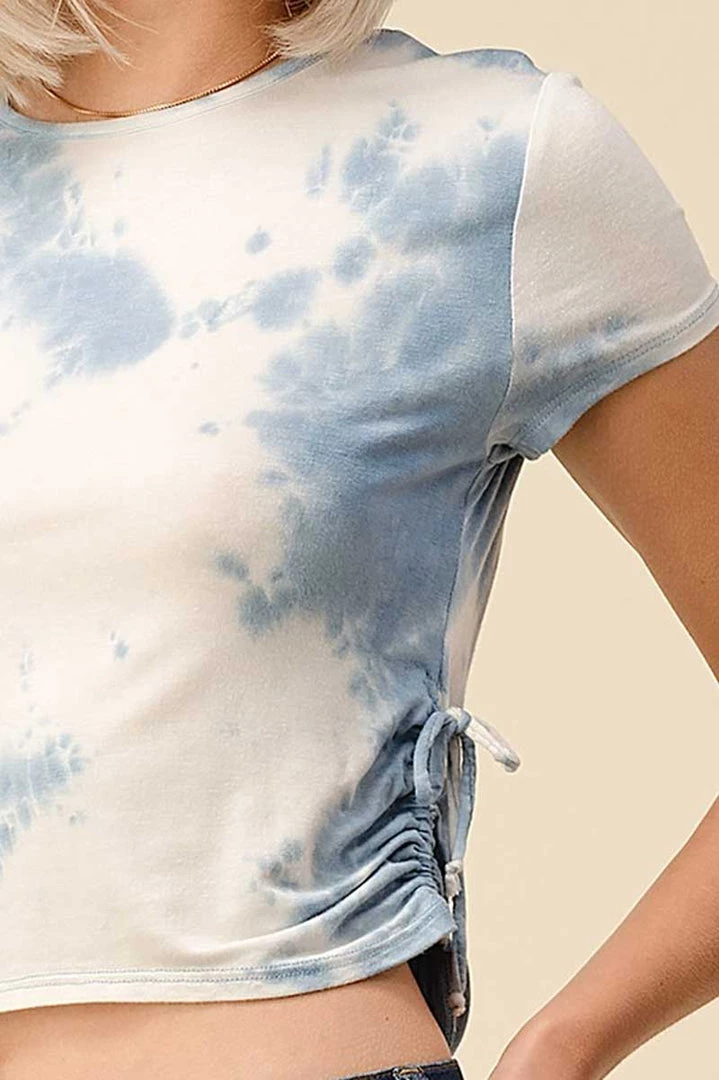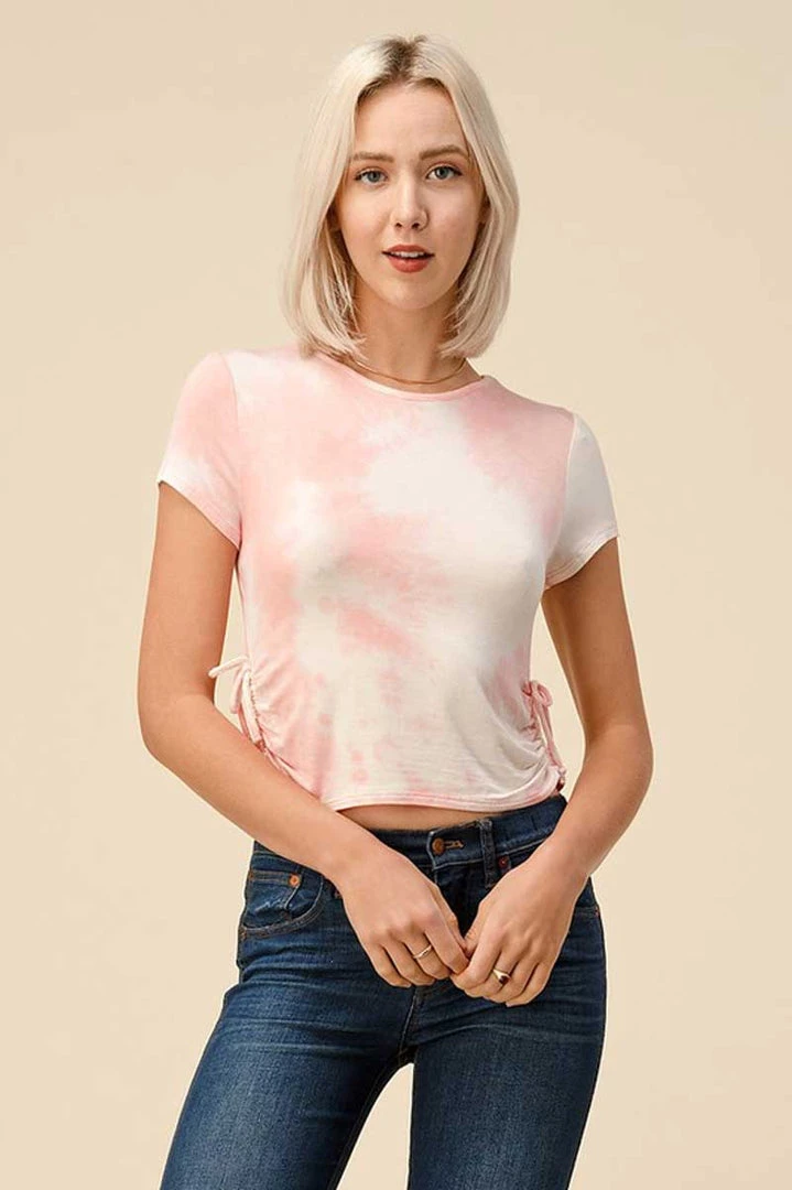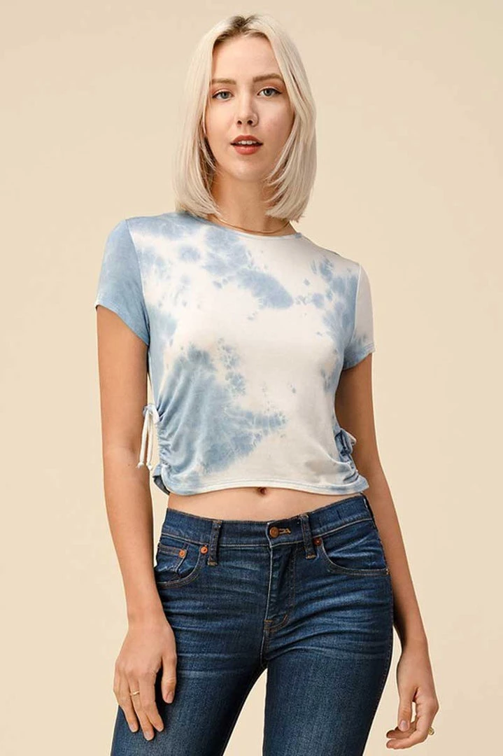 This side ruched tie dyed tee is the perfect choice for the summer season. Available in assorted colors, this top features a crew neck and short sleeve design, allowing for all day comfort. The side tie details make this a cute top cropped or regular length.