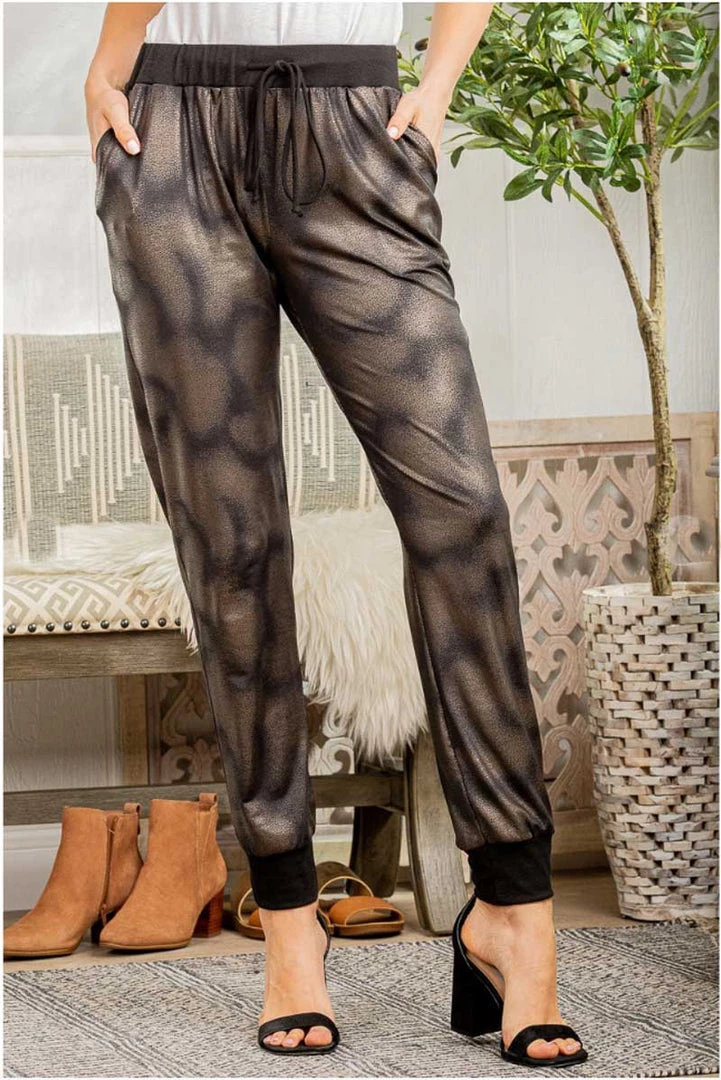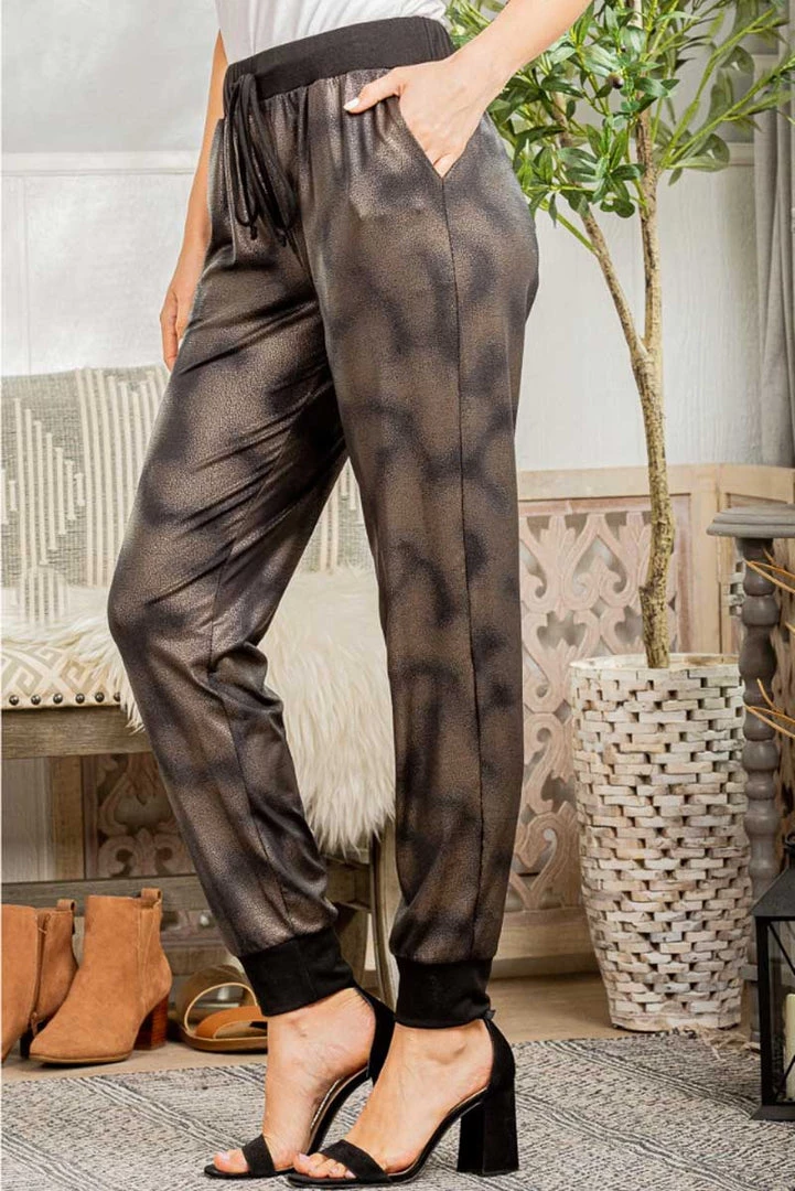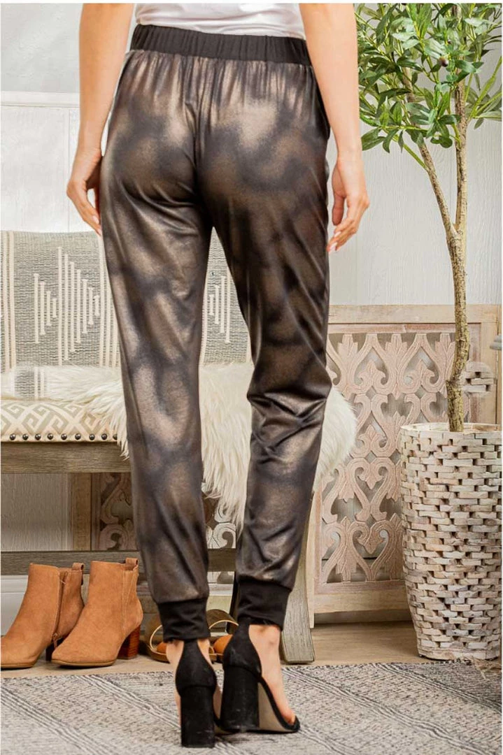 Our faux leather jogger will elevate your everyday ensemble. Crafted from luxurious vegan leather and adorned with a bronze tie-dye effect, this jogger is sure to get you noticed. Style with our Moto jacket for a head-to-toe look that will have you feeling fierce and fabulous.