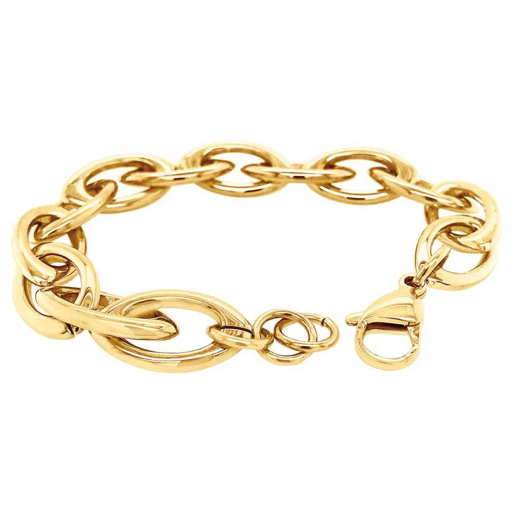 Gold plated stainless steel. Adjustable links. 8″ long bracelet with a lobster claw closure.