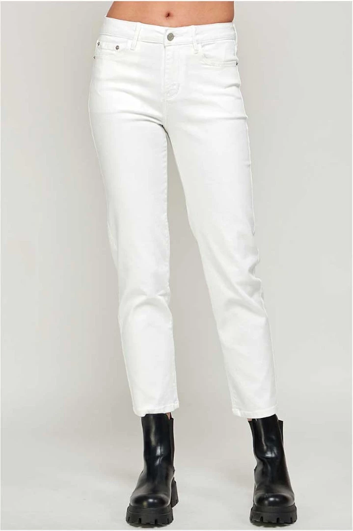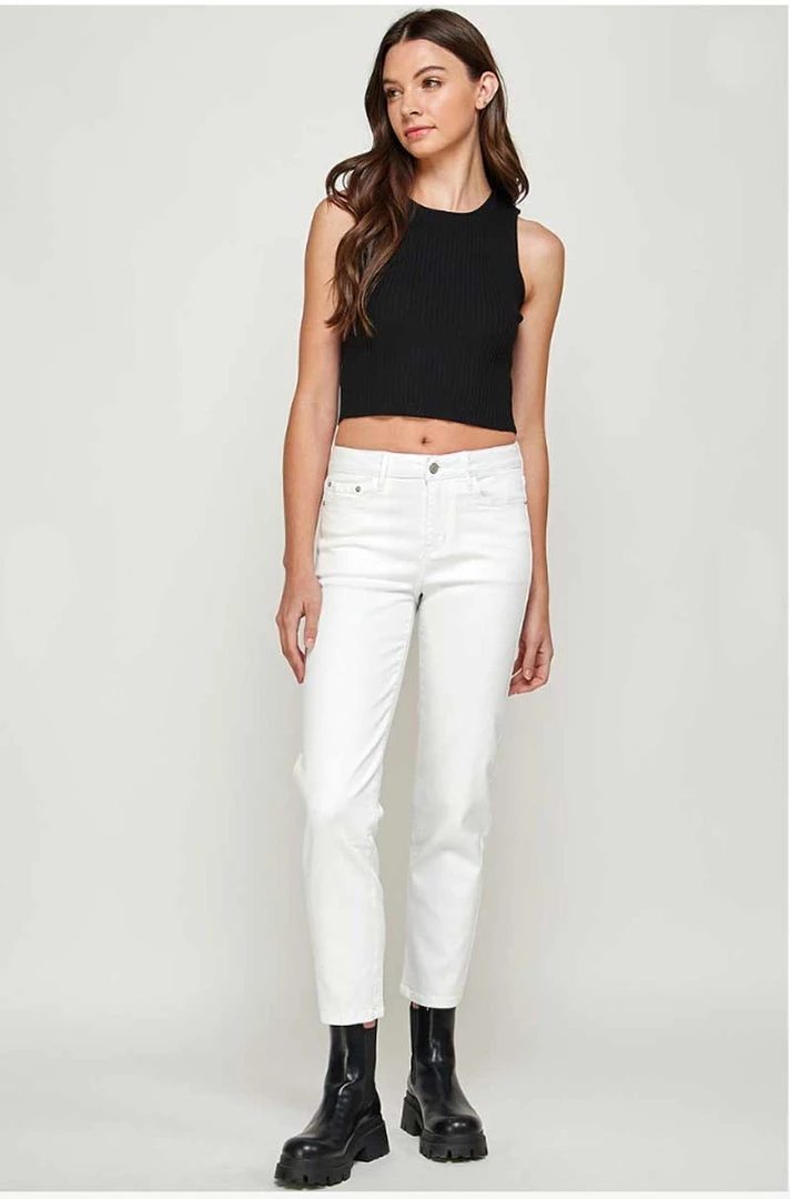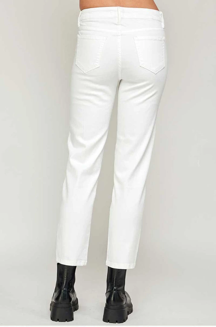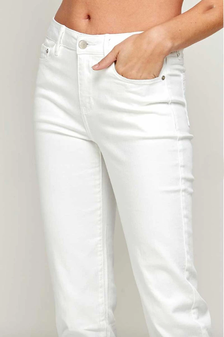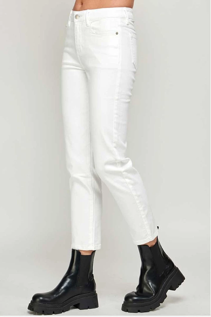 Women’s white straight-leg jeans are featured with a flat front, five-pocket styling, and zipper fly. Mid Rise White Straight Ankle Jeans are made of cotton and spandex. Providing a perfect fit from the first time you wear them.