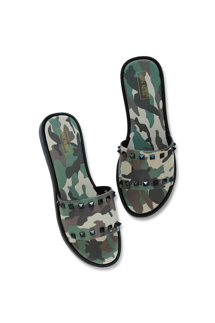 Slides have been on our radar as a summer fashion must have for a few seasons now, but each year we find new styles we want—no, need—to add to our wardrobes. These Studded Camo Slides are the perfect example of this. Designed for the street as much as they are for the pool, they come in a bold camo print in two striking colorways of red and traditional olive green. Adorned with two rows of punk black square studs over a wide band, these shoes are rockstar-level rebellious and to make a long story short, we need them this summer.