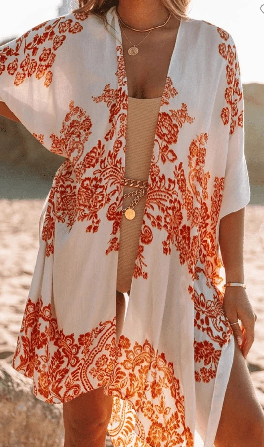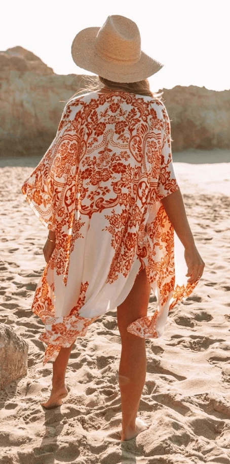 This cute beach cover up is a must have for anyone who wants to look cute in the sun. It fits over your swimsuit, or can be worn as a cover up at the pool, or even to dinner on vacation over a tank and denim shorts. It’s lightweight and breezy. It features beachy floral prints, and is open-fronted.