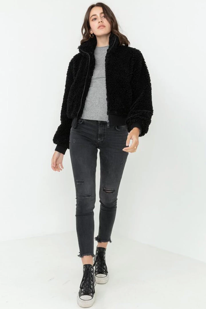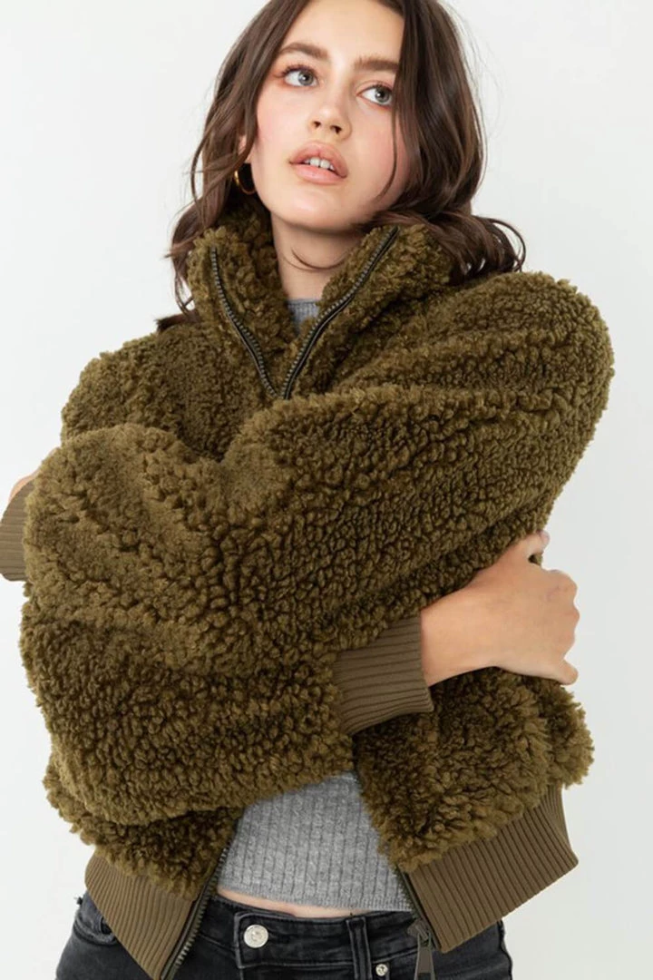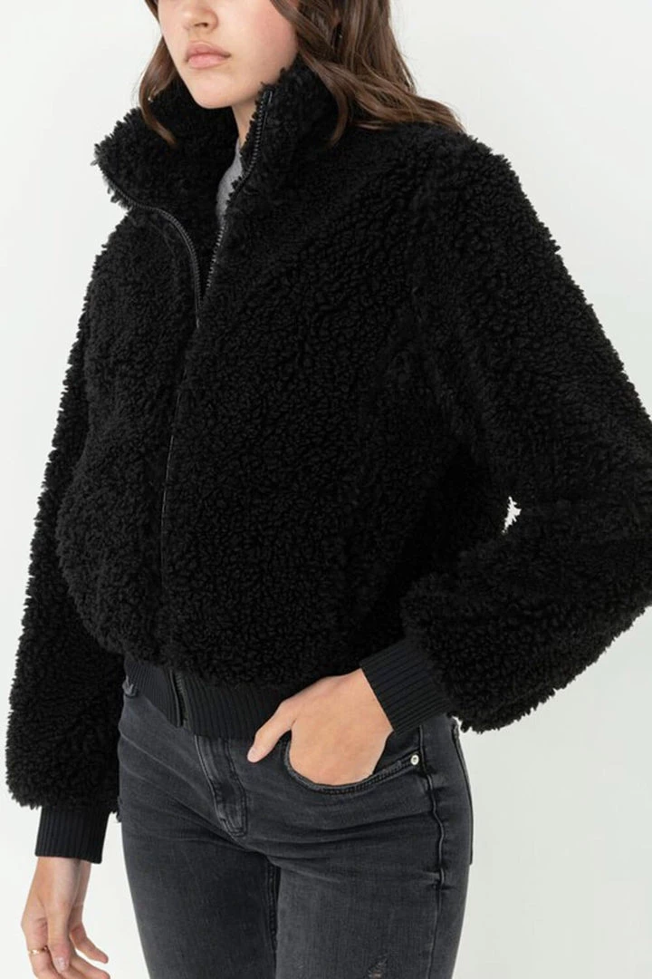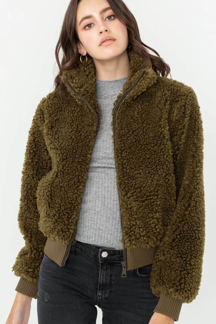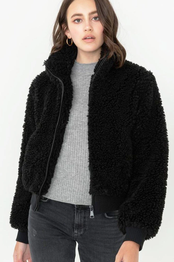 Soft fur zips up long sleeve bomber jacket.