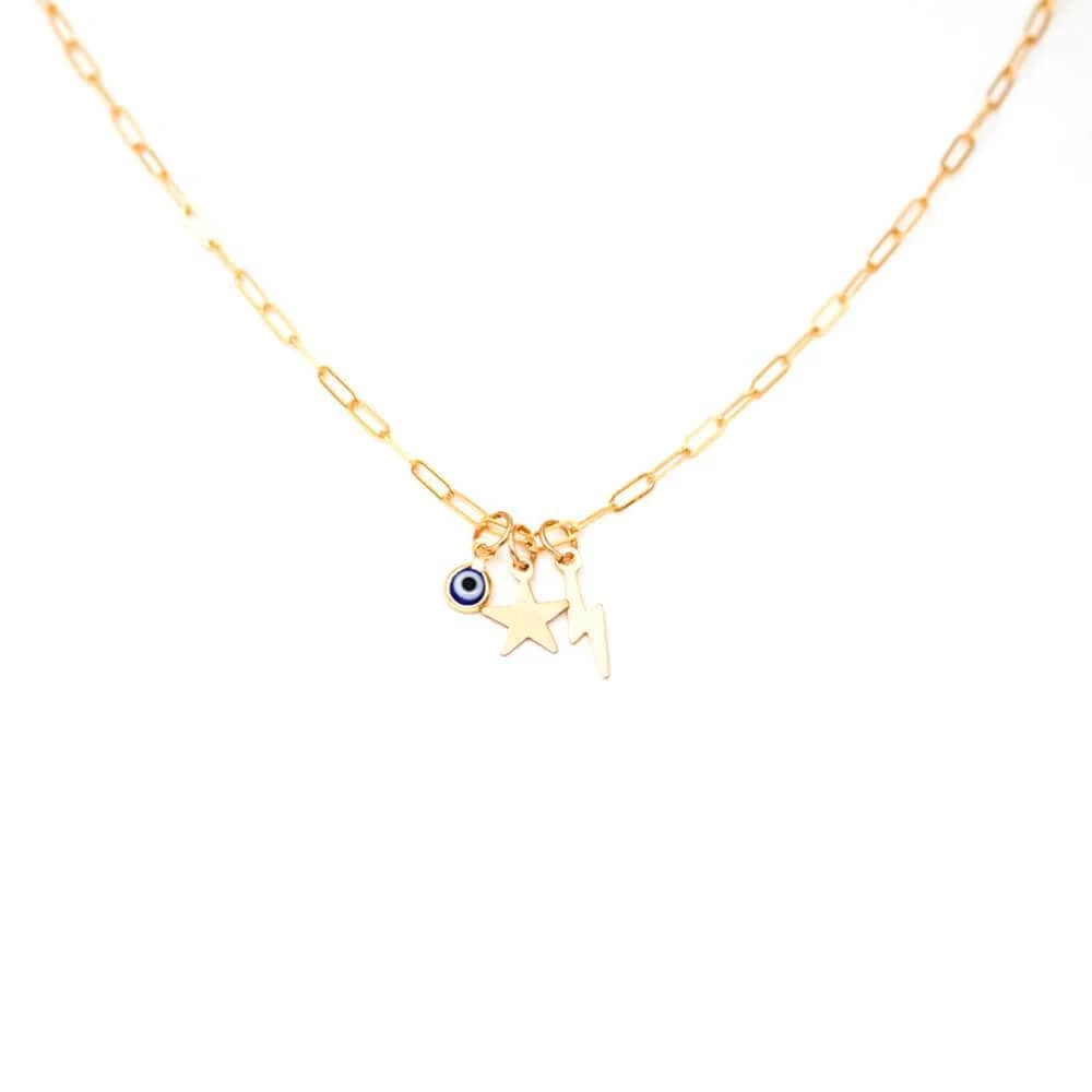 Charm: Less than .25″ evil eye, gold filled star and lightning bolt