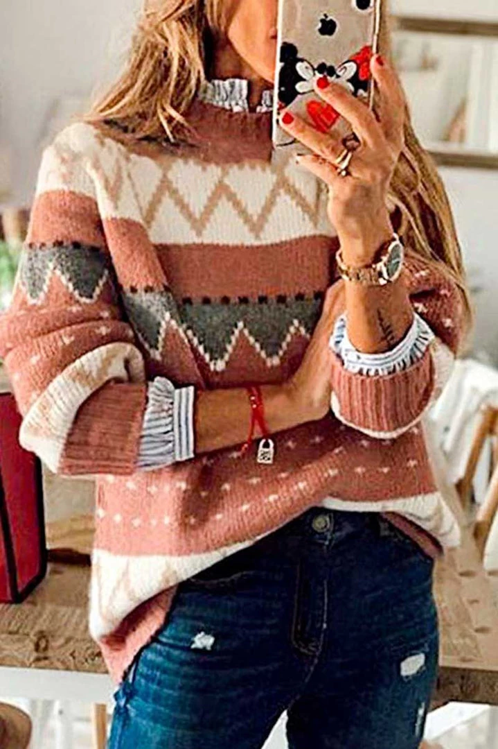You might know this print from the ’80s. We brought it back in a modern way with this geometric crew neck sweater. Wear with your favorite jeans or joggers for a cute look. This is the neutral sweater you can wear every day.