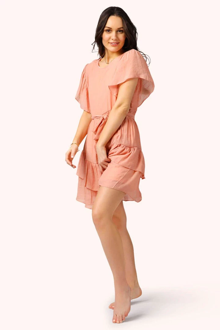 The perfect summer dress: we know her, we love her. Yet, it always seems like we continue searching for just the perfect one. Meet our Ruffles Tie Mini Dress. With its pretty peach blush color, flattering form-fitting tie around the waist, and sweet ruffles, its as if a dress couldn’t get any cuter! Wear casual, or more dressed up, this dress is just-about perfect for any occasion. Pair with our Janey Glitter Birk Sandals for a summer look made to stand out, or with our Studded Crossband Slide Sandals for the perfect beach date ‘fit.