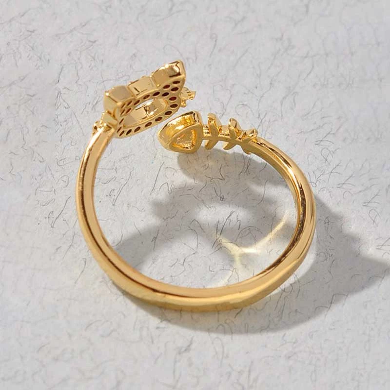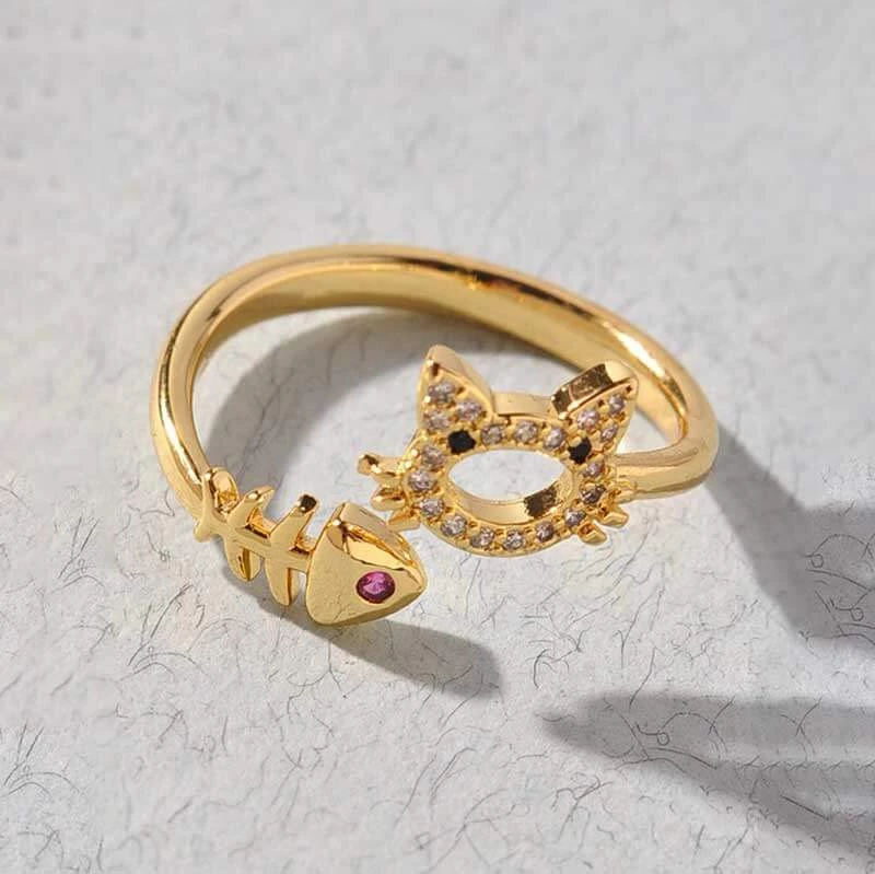 Add a bit of everyday whimsy to your jewelry collection with this adorable detailing ring. This open-face ring is crafted in gold plating and features pave crystal details on the cat face in contrast to the pink crystal fish eye on the other side.