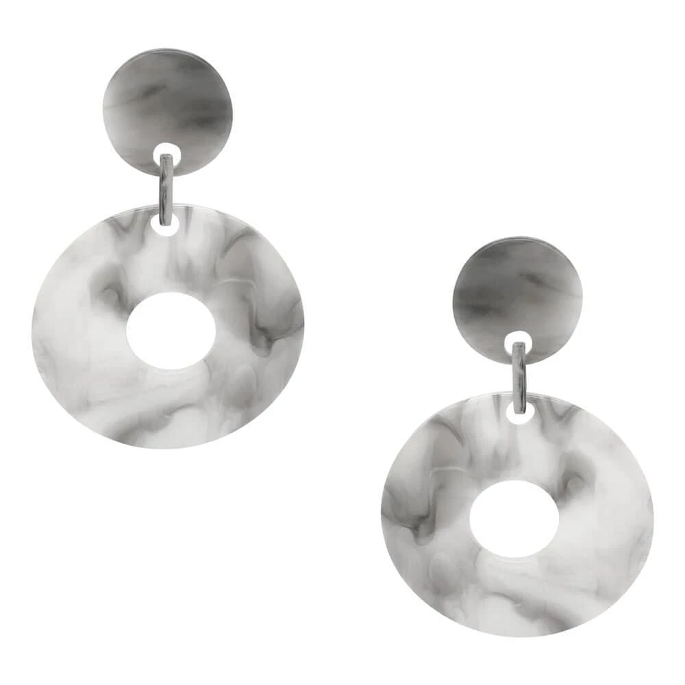 Smokey gray resin earrings in a pretty circle design. 3″ Tall x 2″ Wide