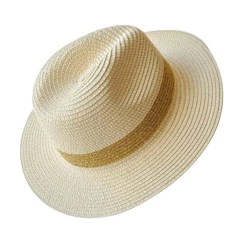 The Summer Fedora Hat is a cute hat for women. The Fedora style is great for summer, paired with a casual outfit. An easy way to put a little shine in your hair and look cool! It features a gold band on the brim and all natural tan fabric.