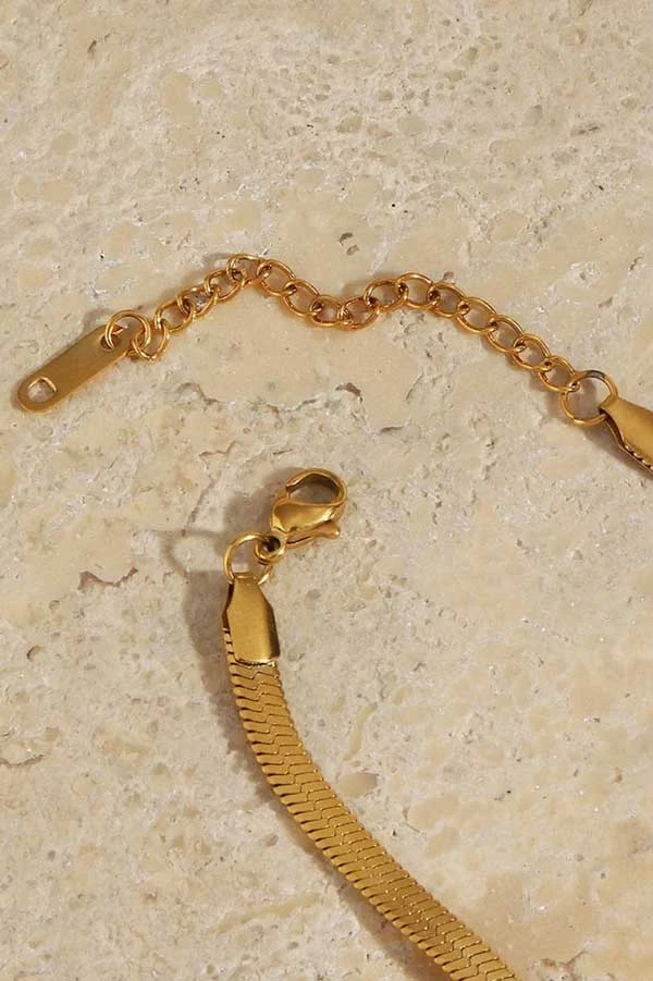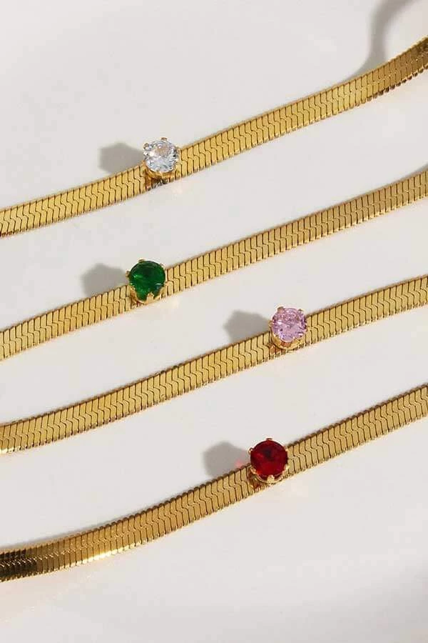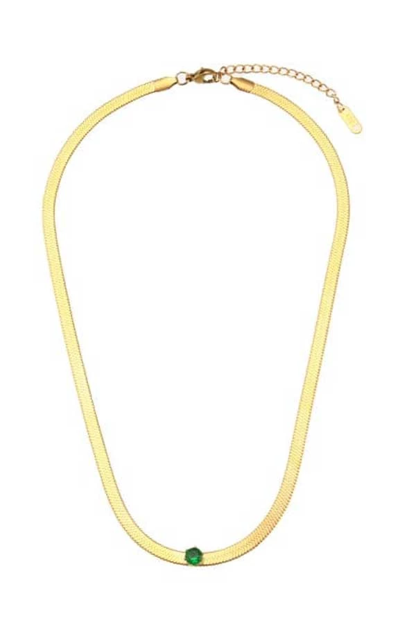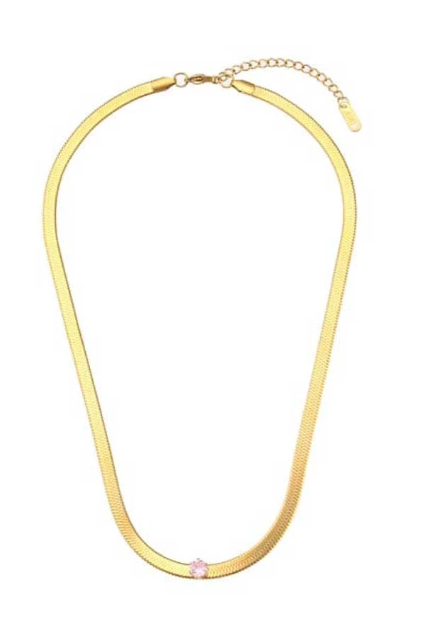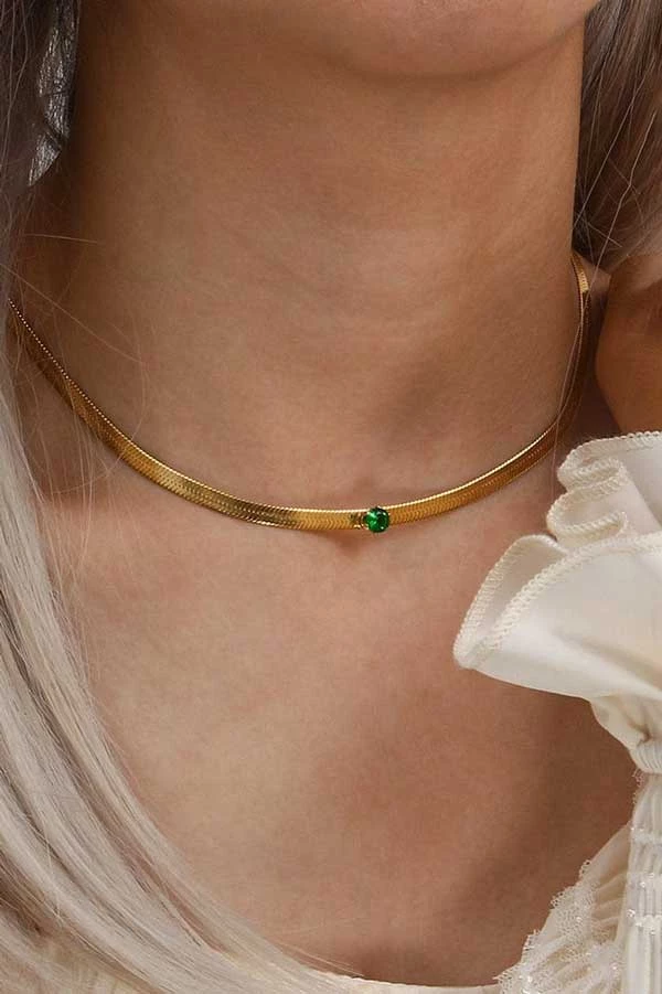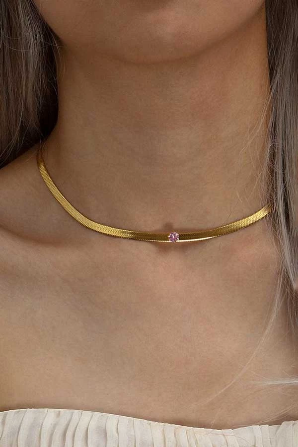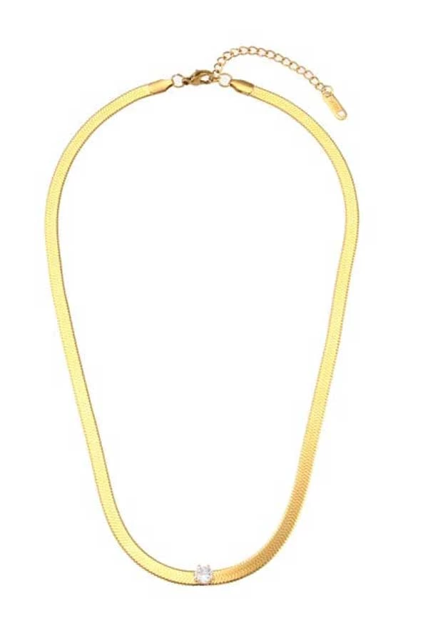 The Herringbone Chain Necklace features a stunning herringbone chain and a single solitaire CZ stone. The collar necklace has an adjustable closure that’s easy to put on and take off. This gold plated necklac is made of stainless steel and plated with 18k gold for an elegant look. We love this necklace for pairing over tops and dresses or alone as a statement piece.