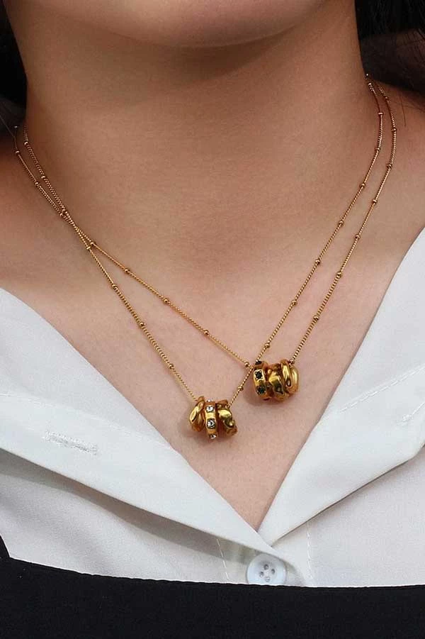 These adorable three charm necklaces are perfect for everyday wear. They feature three small irregular loop beads in gold-plated stainless steel. The first charm is green CZ pavé and the second and third charms are both clear CZ pavé. Layered together they create a lovely multi-tone look that will dress up any outfit.Treat yourself, or gift to a lucky friend.