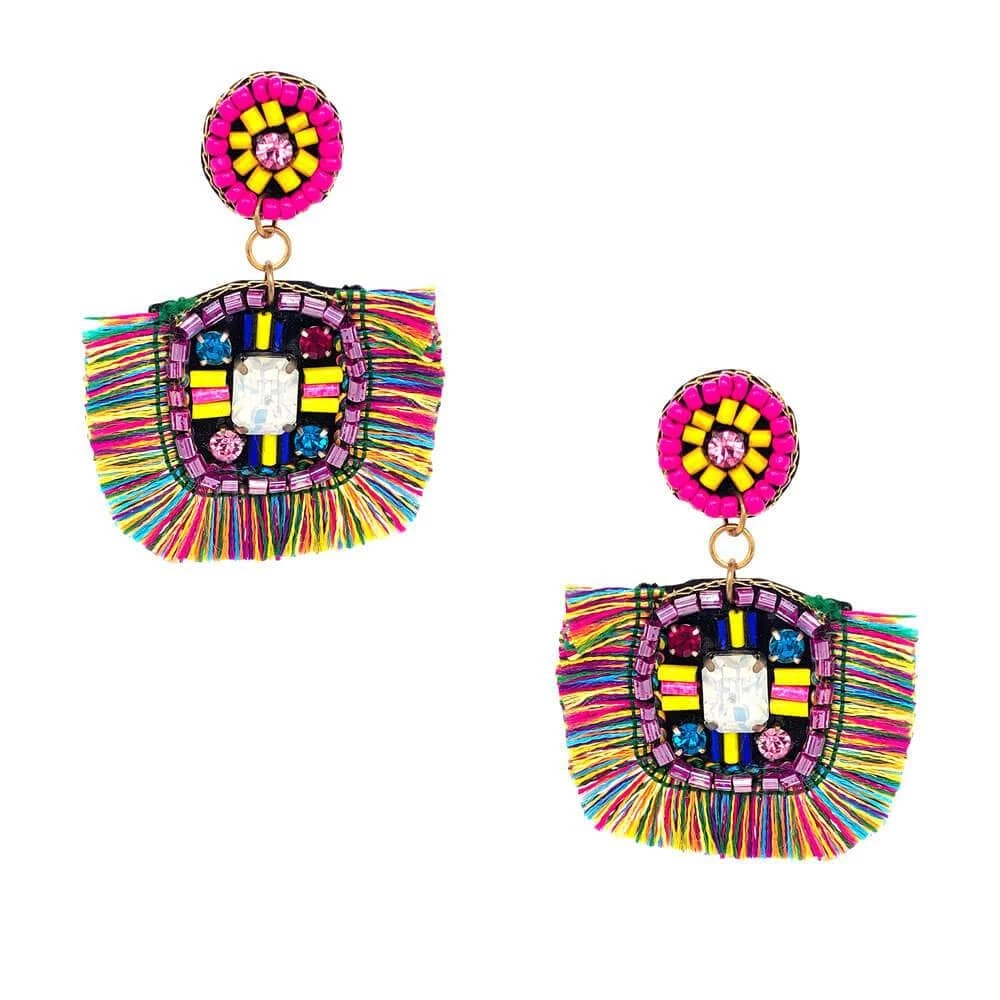 Beaded, Aztec-inspired earrings with multicolored fringe. 2″ Tall x 2″ Wide