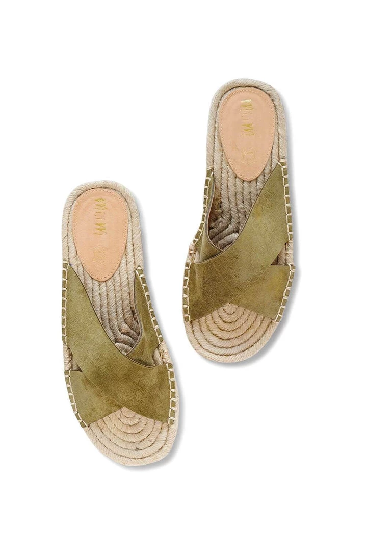 With a traditional flexible woven footbed, this slip on style features wide, suede-like textured straps that cross at the toes to hold the foot in place. The straps come in olive green, a color thatâs lighter than black and easier to keep clean than white but will still go with any of your summer outfits. If youâre the kind of girl who loves wearing neutral hues, youâre in luckâthis dainty olive hue will just add a pop of warm weather color without being too overwhelming. Or, if youâre excited to explore the bright retro color palette thatâs sure to be a hit this season, itâll match with those too. Sturdily constructed, the woven sole will massage your feet and provide a comfortable base to walk in as you head out to your summer plans. A textured bottom sole gives traction, while contrast stitching along the sides adds to the rustic effect. Pair these with cropped pants for urban exploring, or a light, fluttery dress and sun kissed skin for more of a Positano or St Tropez vibe. Even if you donât make it away this summer, this shoe is still city appropriate. Whether youâre trying to dress for that killer internship or a weekend date, this sandal will complete your look with a bit of cosmopolitan flair.
