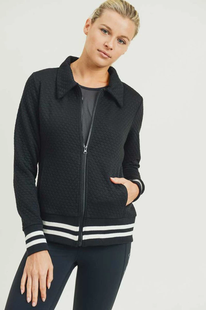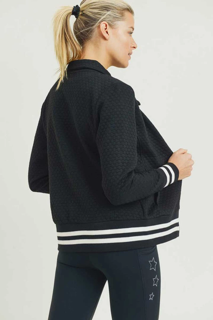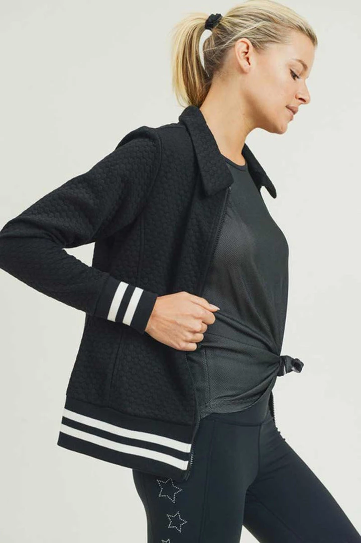 Honeycomb Quilted Varsity Active Jacket is made with a soft, breathable fabric that wicks moisture away from the body to keep you comfortable. Designed with a trendy, quilted look, it features a zipper closure with waist tabs that keep the jacket in place during vigorous workouts. Supersoft and lightweight, this sporty jacket has stripe ribbing at the hem and cuffs. Pair it with your favorite leggings and workout tee for working out at the gym or running errands around town.