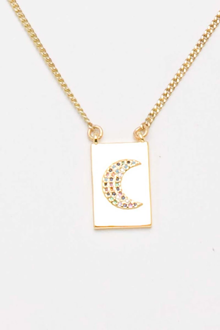 A little piece of the natural world has never looked so pretty. Pavé Dog Tag Charm Necklace features a detailed crescent moon made from rainbow pavé stones set in gold-plated brass. It’s small but detailed enough to make a big statement.