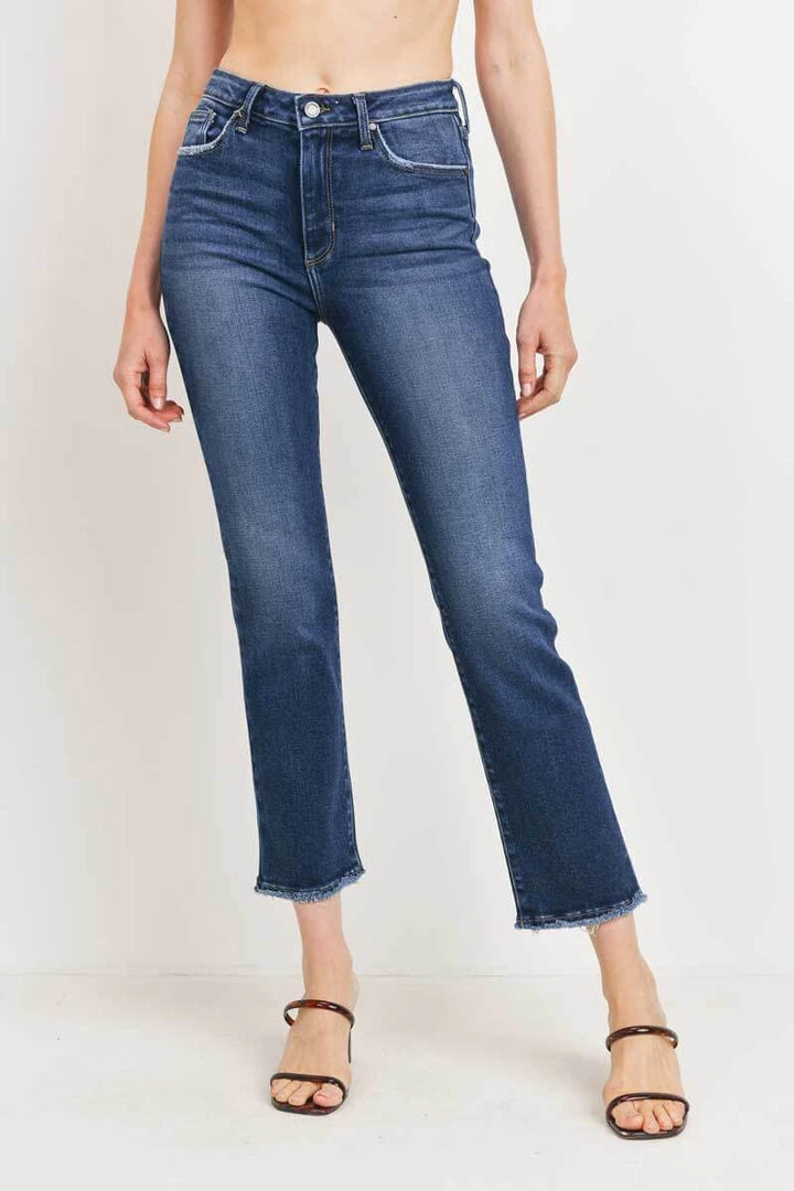 These straight leg jeans for women by Just Black have a dark wash and have been distressed at the hem. These jeans have been stylishly designed with an oh-so-flattering high rise waist and a 5 pocket design. Stretch fabric allows the jeans to fit curve hugging, anyway, they are worn. Darker denim makes these pants classic! Being super popular now they are bound to sell out quickly.
