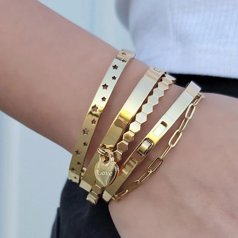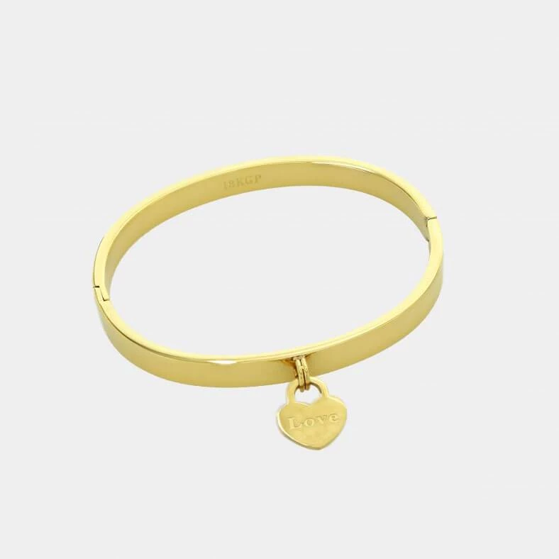 18k gold plated over stainless steel bangle with two dangling heart charms. The top charm has ‘LOVE’ engraved.