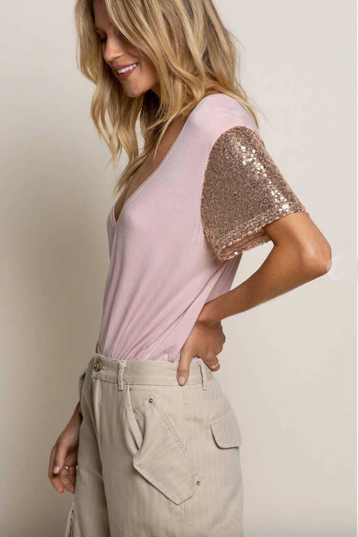 Casual and stylish, this sequin short sleeve tee is a must-have for any woman on the go. A sparkly, fashionable update to your wardrobe, this top will quickly become one of your favorites. In a trendy deep v-neck with sleeves that hit just above the elbow, it’s an easy piece to style with jeans or leggings. Layer under a cardigan, wear tucked into a skirt or shorts, or pair with a cute headband – whatever you choose, this top will look great. Available in two colors: grey and pink.