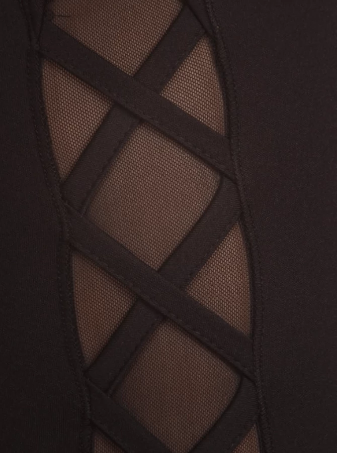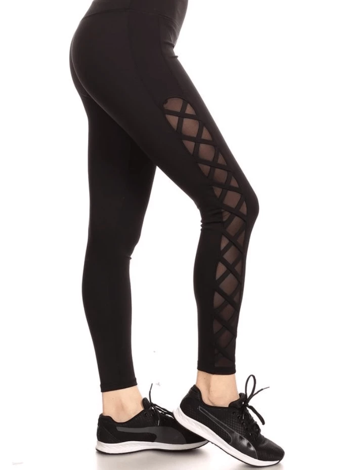 These leggings are solid, thick stretch knit. They are high rise active sports leggings and yoga pants. They have tummy control, slimming 4 way stretch and curve control in a fitted style, with side mesh leg panels and criss cross straps. Stretchy and comfortable. You’ll wear them everyday. The Essential Legging. 93% Polyester 7% Spandex.
