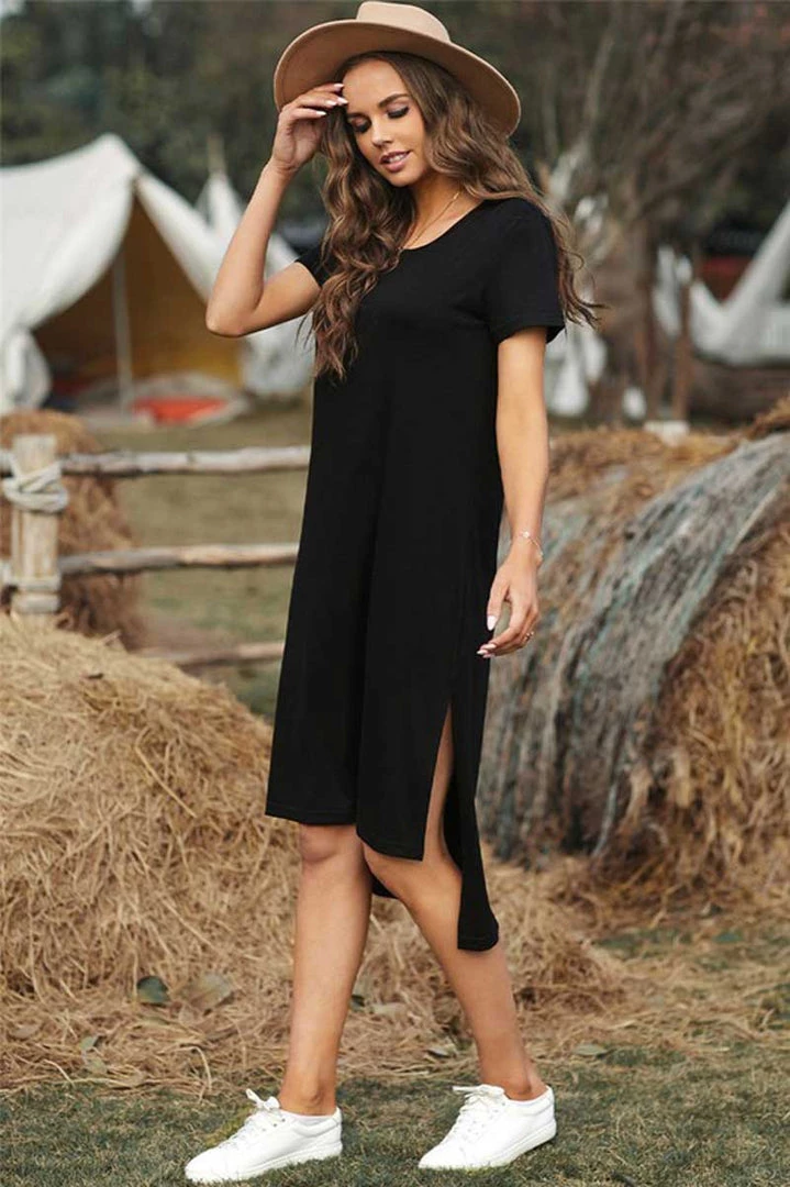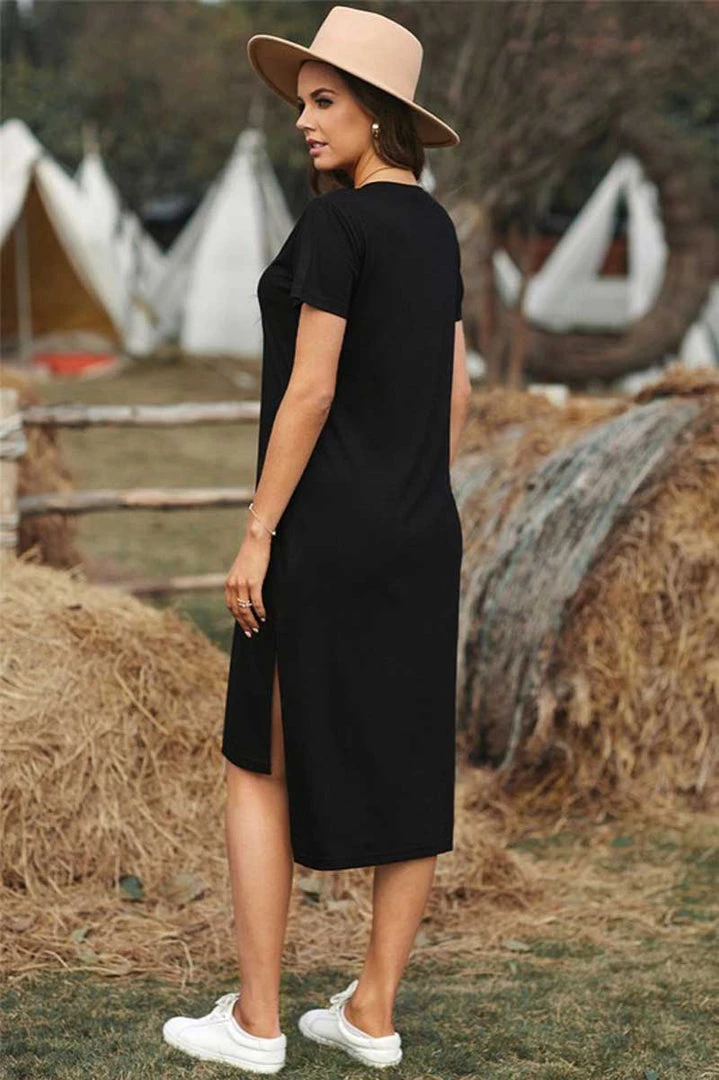 Looking for a casual yet fashionable summer dress for the beach or park? The Casual Short Sleeve T-Shirt Midi Dress is a top choice. Made of thin and breathable t-shirt fabric, this dress boasts a high split design with a hem that can be wrapped and knotted to achieve different looks. This must-have dress comes in a variety of colors to choose from.