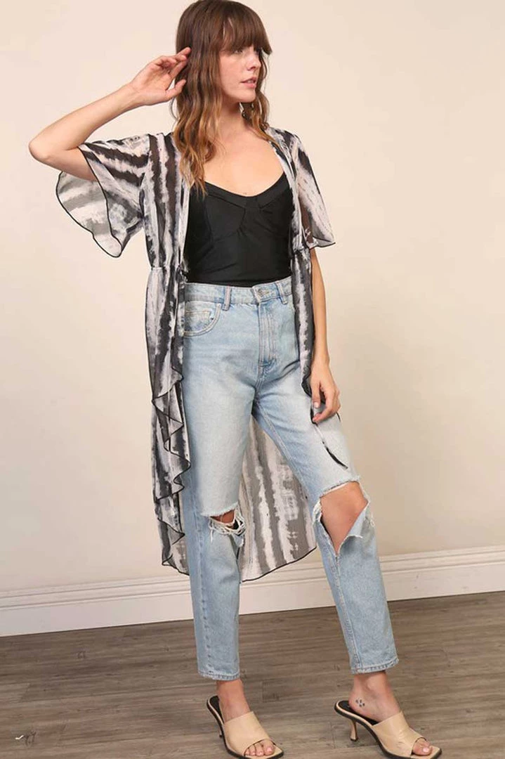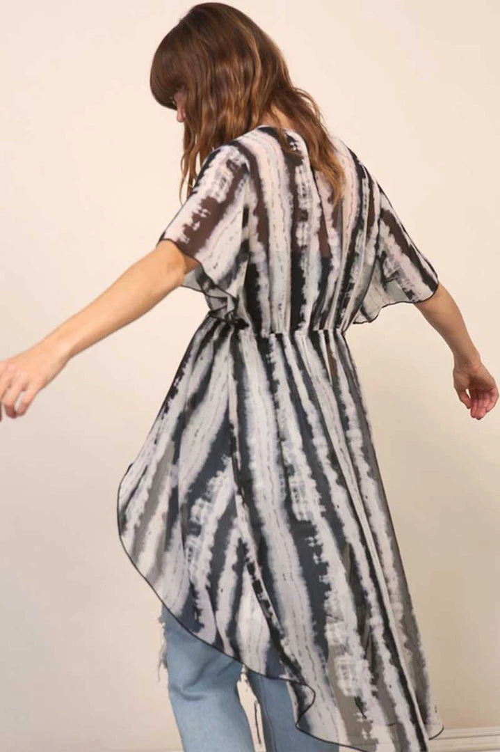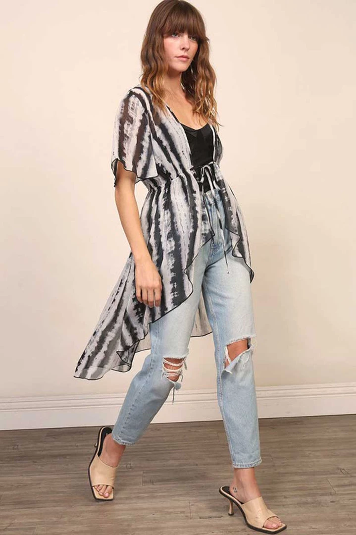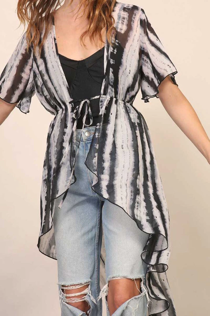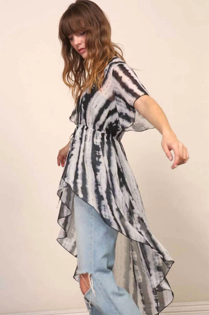 This Chiffon Tie Dye Kimono Cover Up is a high-low kimono that will keep you covered up, and looking fabulous. Made from gorgeous tie-dyed chiffon, it features an elastic waistband. The front can be tied in a bow in the front or tied in a knot in the back. Wear this tie dye cover-up on the beach as a cover up, or pair it with some leggings as an outfit option!
