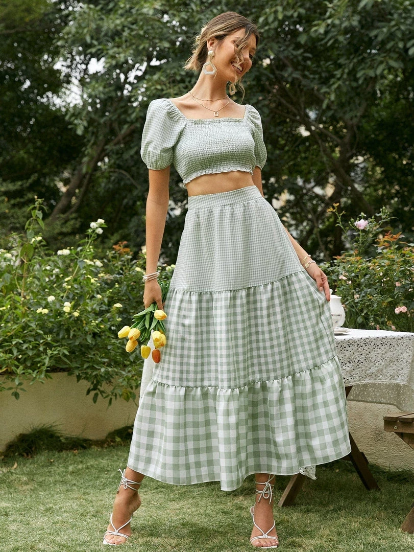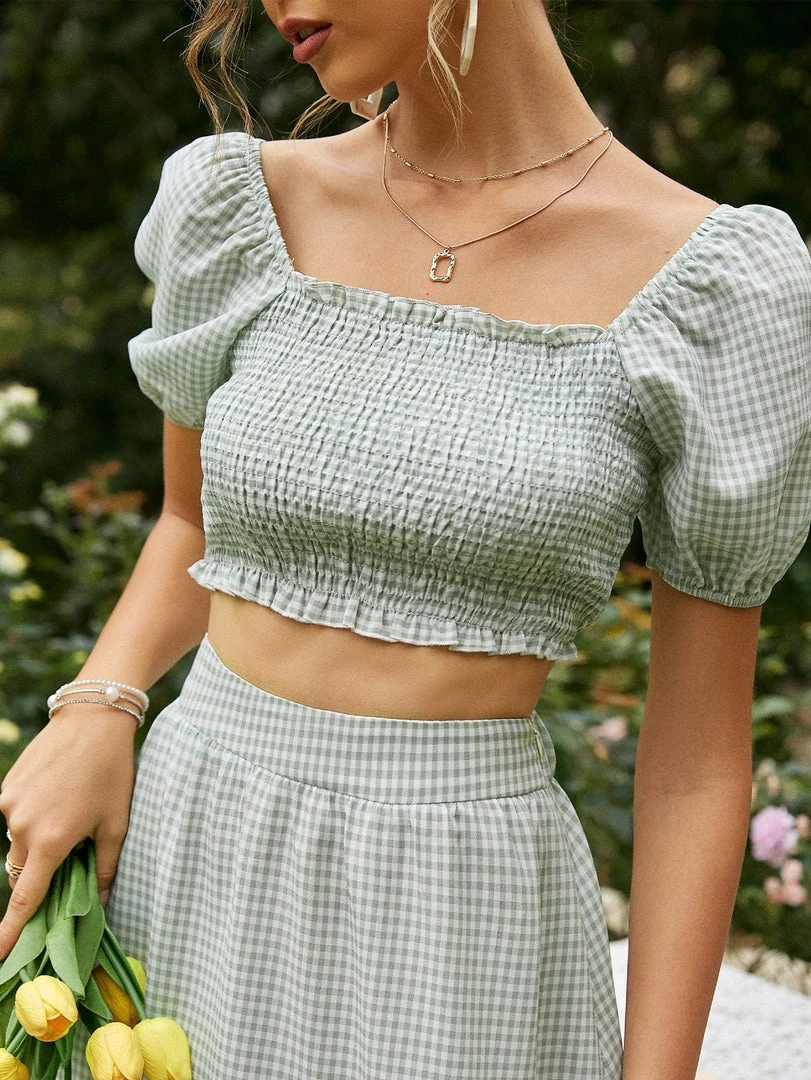 - Features: Smocked, short puff sleeves, tiered, cropped