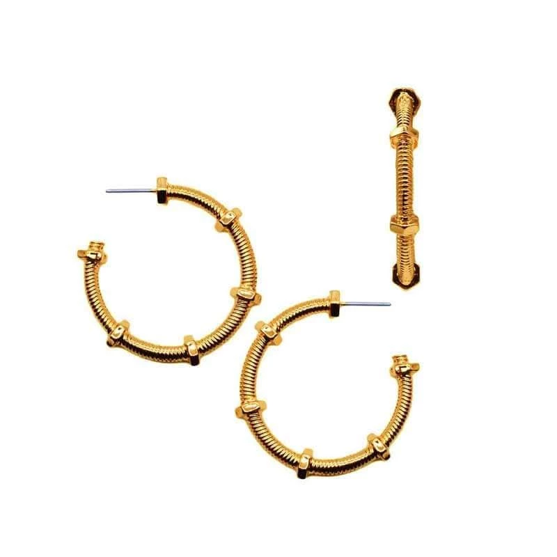 Beautiful earring sets for modern girls. These hoop earrings with gold plating and the bolt and nut details will perfectly complement your outfit and set you apart from everyone else. Post closure. Luxury inspired